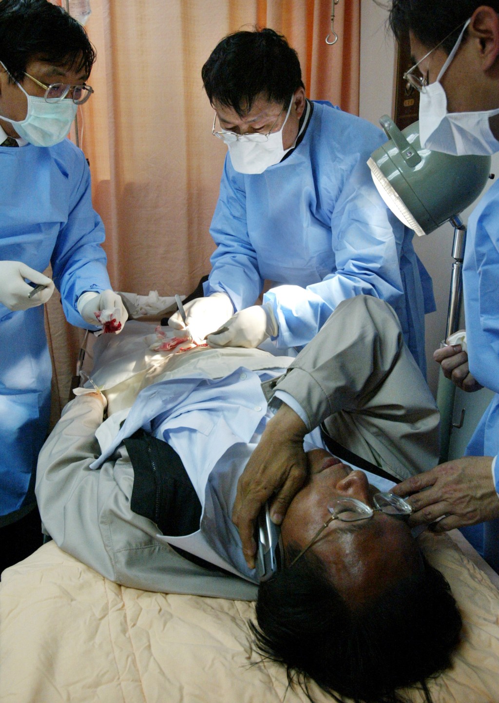 陳水扁腹部中槍后,邊縫針邊講電話。美聯社