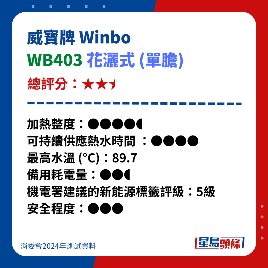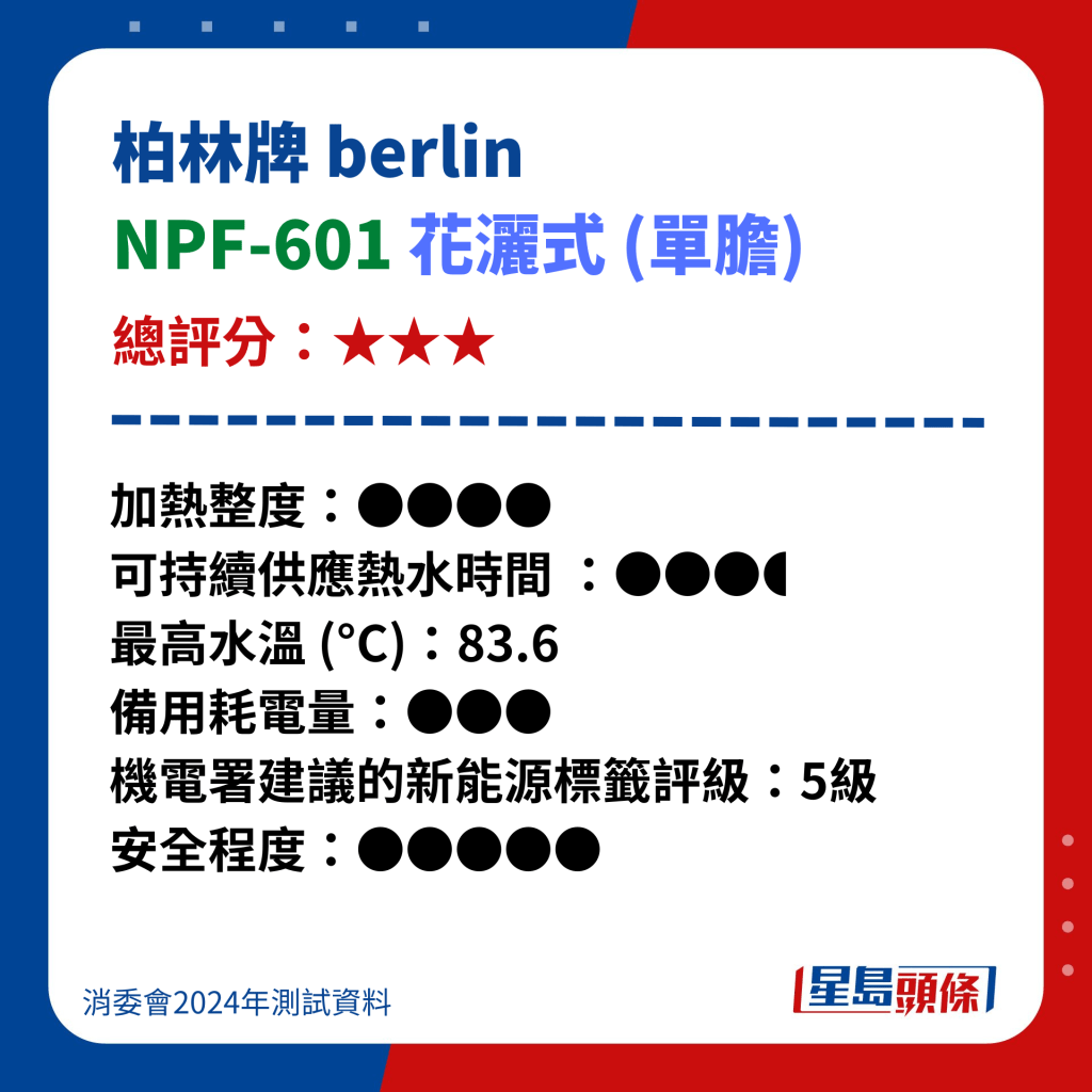 另外有3款樣本量得的備用耗電量,較能源標簽上標示的高出12.5%至30.1%,在按建議的新能源標簽評級標準被評為最低分5級,表現遜色。 該3款儲水式電熱水爐包括《柏林牌berlin》、《威寶牌 Winbo》及德國德信KüZZO。