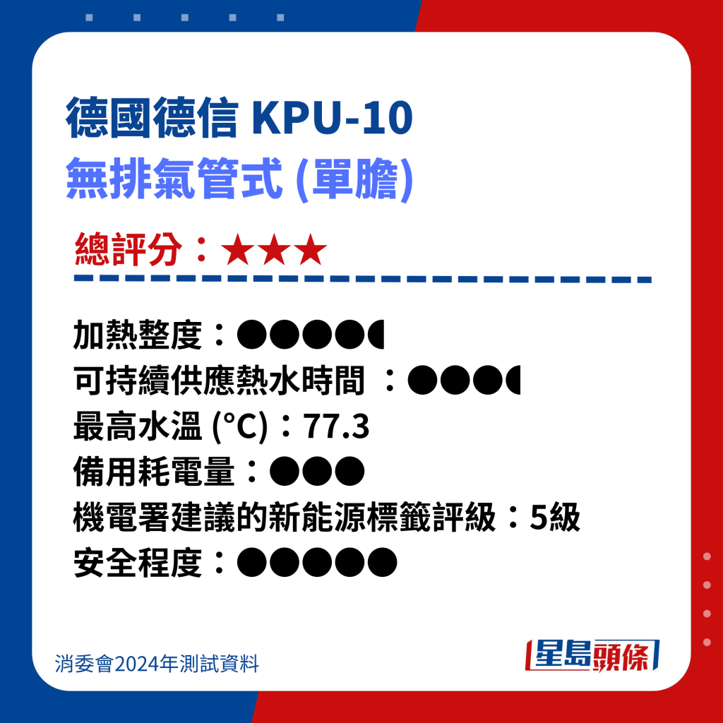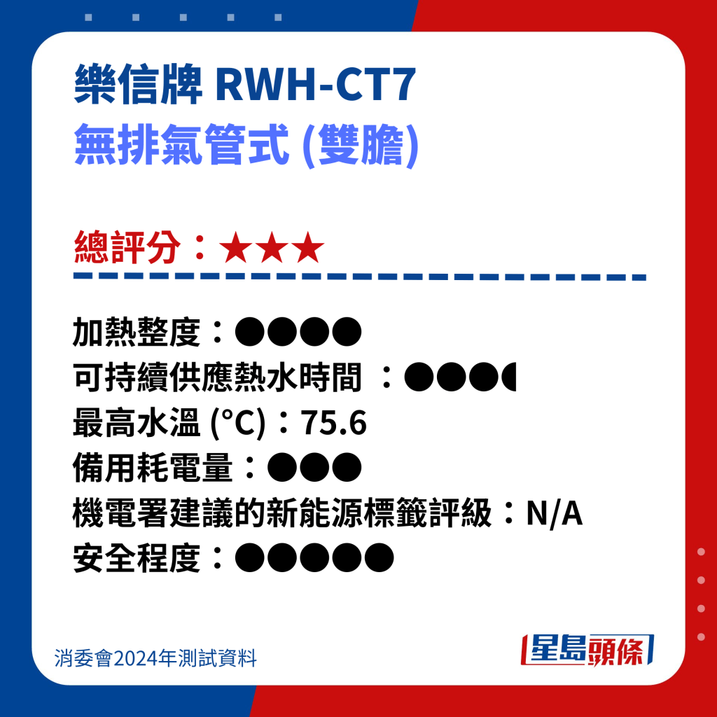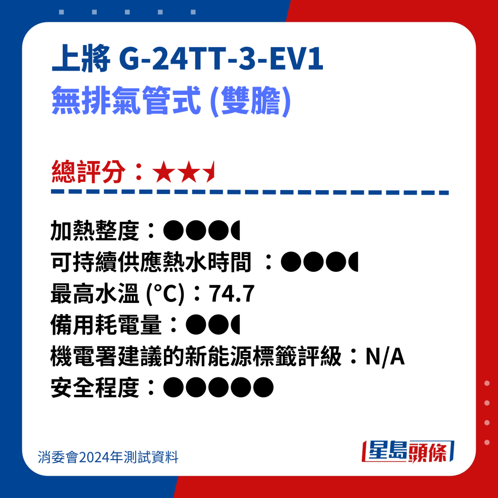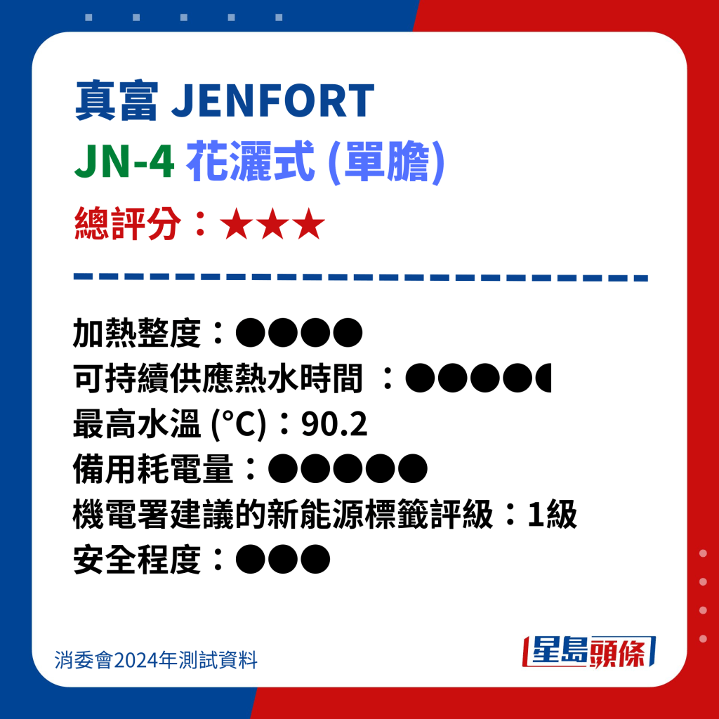 消委會測試了7款單膽電熱水爐的能源效益,而5款雙膽電熱水爐則因為不在現時機電署的強制性能源效益標簽計劃內故未有測試。 消委會分別采用了最新版本IEC標準及機電署的強制性能源效益標簽要求來測試,分為1至5級別,1級表示儲水式電熱水爐的能源效益最高、最省電。 7款單膽電熱水爐中,“真富 JENFORT”在兩項測試標準中均獲得1級評分,表現最佳。
