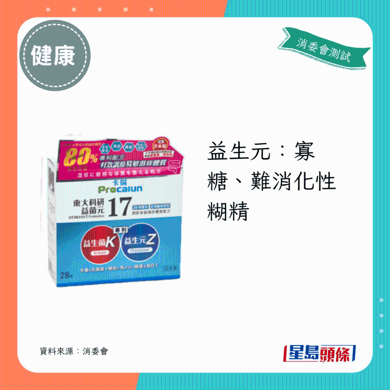 根據第567期《選擇》月刊,消委會在市面收集了40款聲稱能提供益生菌的膳食補充劑,包括:6款標示為女士專用;11款為兒童專用;另有 23 款普通益生菌樣本,其中 9 款標示少于 12 歲的兒童皆能食用,有 11 款則沒有標示適用年齡。樣本的售價由$99至$788,若以每日食用分量計算,則由$5.3 至$52.6 不等,價格相差近9倍。
