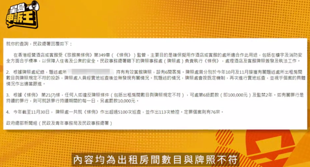 民政總署回復查詢,承認早前2次收到關于上述賓館的投訴,內容均為出租房間數目與牌照不符。牌照處實地巡查后,沒發現有關情況,但強調會按機制再次實地巡查。
