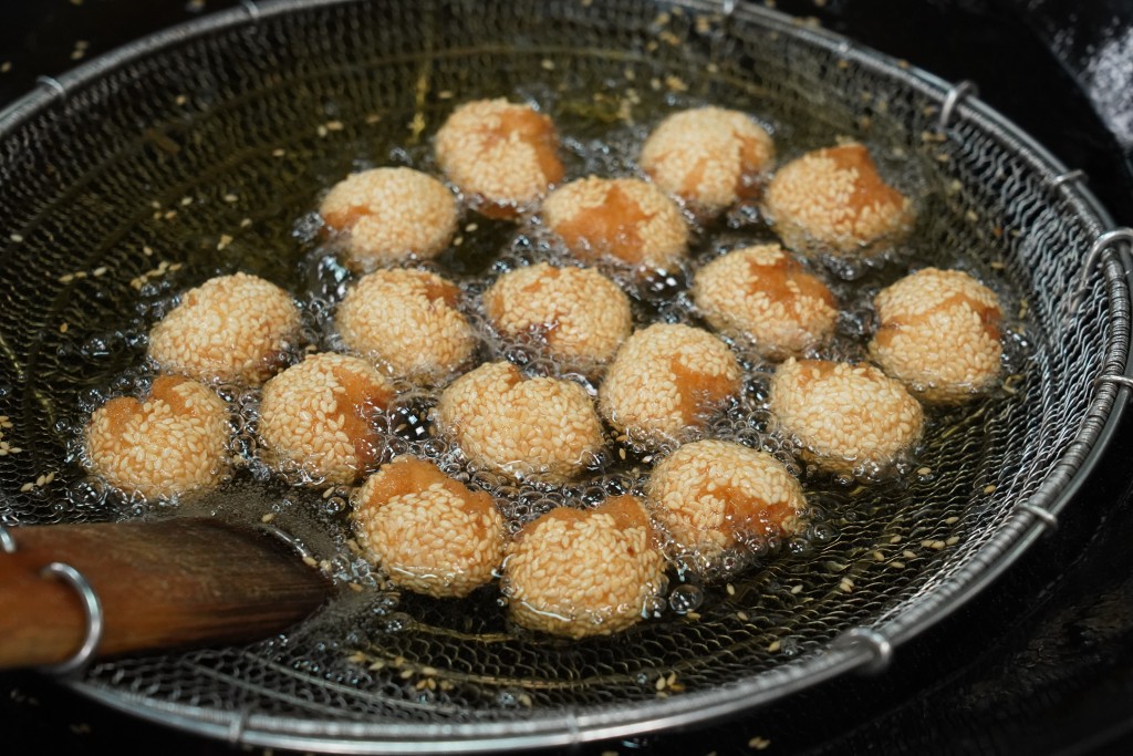 先將雞蛋、白砂糖、吉士粉、泡打粉及菜籽油拌勻,白砂糖溶化后加低筋面粉。選用低筋面粉做笑口棗,因蛋白質較少,粉質細滑,麩質少因此筋性低,能制成酥松香口的笑口棗。留意加面粉后,不要大力搓揉,避免面團起筋,影響口感。搓揉正確方法是用手指由底往上按壓,直至所有材料融合成面團。將面團分成數等份后搓成圓球粒狀,謹記沖水令笑口棗面團表面濕潤,便能更容易均勻地沾上白芝麻。先以約140度炸至面團浮起,炸約6至8分鐘或金黃色后,可調校大火令油份滲出才撈起,吃起來香脆不油膩。