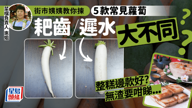 蘿卜是常見根莖類蔬菜,也是秋冬季節的當造食材,好像白蘿卜、紅蘿卜、青蘿卜,各品種分類都能夠用應用于不同食譜。 今日請來寶林市場菜檔負責人,拆解街市常見5款蘿卜品種的特性、料理方法、宜忌及保存貼士,原來它們并非全屬蘿卜家族,屬性、宜忌各有不同,其中2款蘿卜更不能與補氣中藥同期間服用,加上農歷新年臨近,應選哪款白蘿卜蒸蘿卜糕? 白蘿卜原來也可分成遲水蘿卜、耙齒蘿卜兩款,當中大有學問。