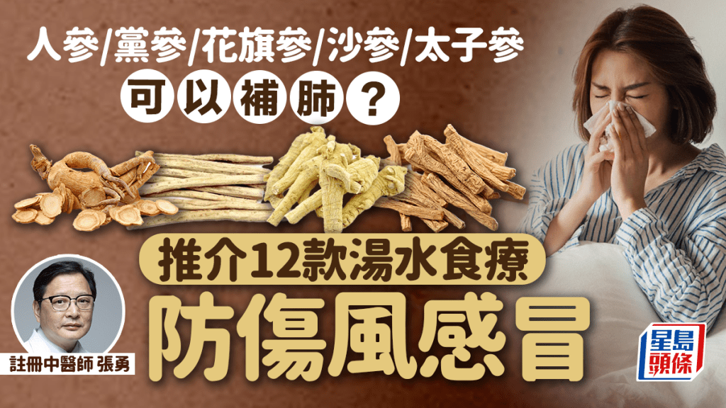 傷風感冒飲食|近日呼吸系統疾病感染數字不斷上升,除了傷風、感冒,流感及新冠變種病毒等個案亦趨增。要防御病毒入侵呼吸道,中醫學認為必須增強肺臟機能,補充“肺氣”,方可提升免疫力。注冊中醫師張勇教大家,如何選用人參、黨參、花旗參、沙參、太子參等5款參類藥材,加強肺部正氣,并推介湯水、茶飲,補肺預防傷風感冒,加快病后復元能力。