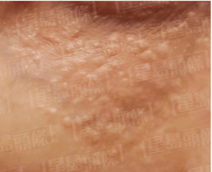 *呈肉色或啡黃色、圓形或不規則形狀、輕微突起且平頂的細小顆粒;約1至4毫米,可以不均勻分散出現或數粒聚在一起。