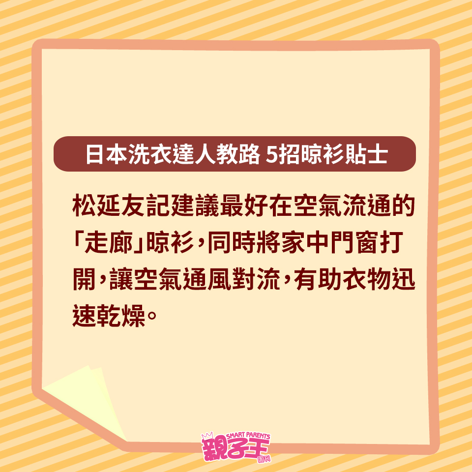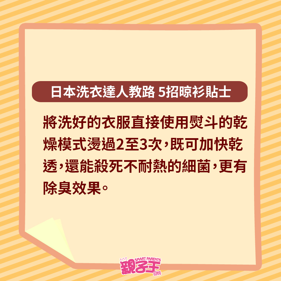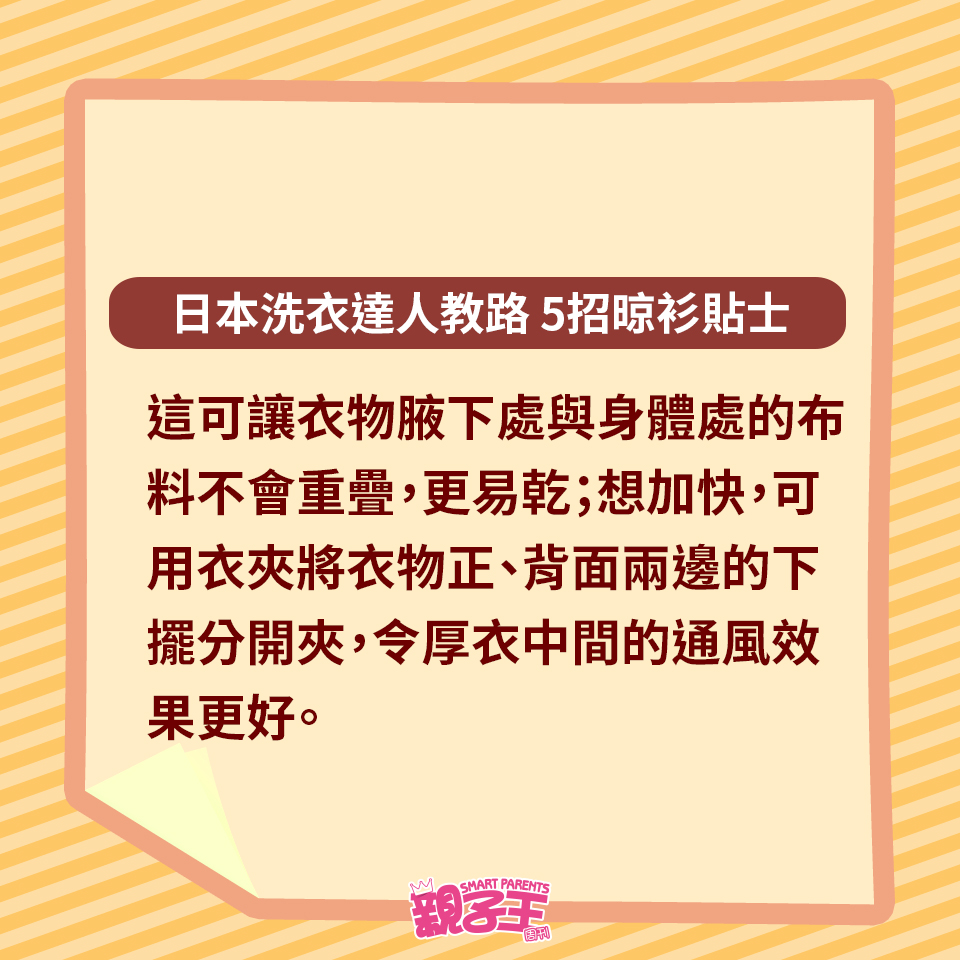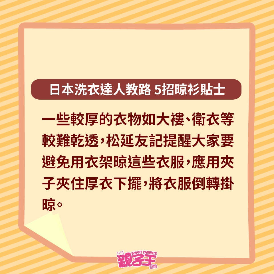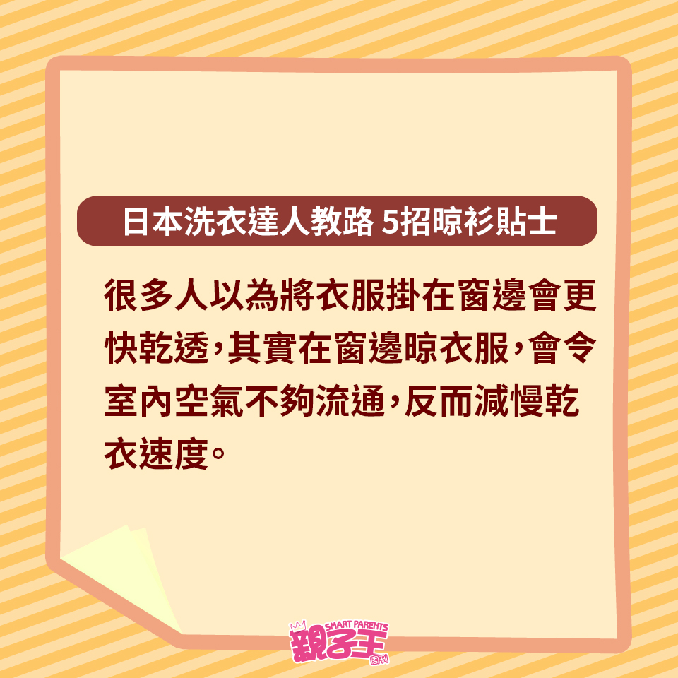 香港天文臺天氣預報顯示,這星期相對濕度天天達80%-95%以上!媽媽們就最討厭這種天氣,事關洗完衣服難以晾干,衣服又易滋生細菌而傳出難聞霉味。日本洗滌達人松延友記就教大家5招干衣晾衫貼士,令衣服在這個回南天時仍可盡快干透,減少霉菌量;而衣服干透后亦要學識日本家事達人每田祥子的4個衣服防潮濕法,衣服才可時刻保持干爽,保持氣味清新。