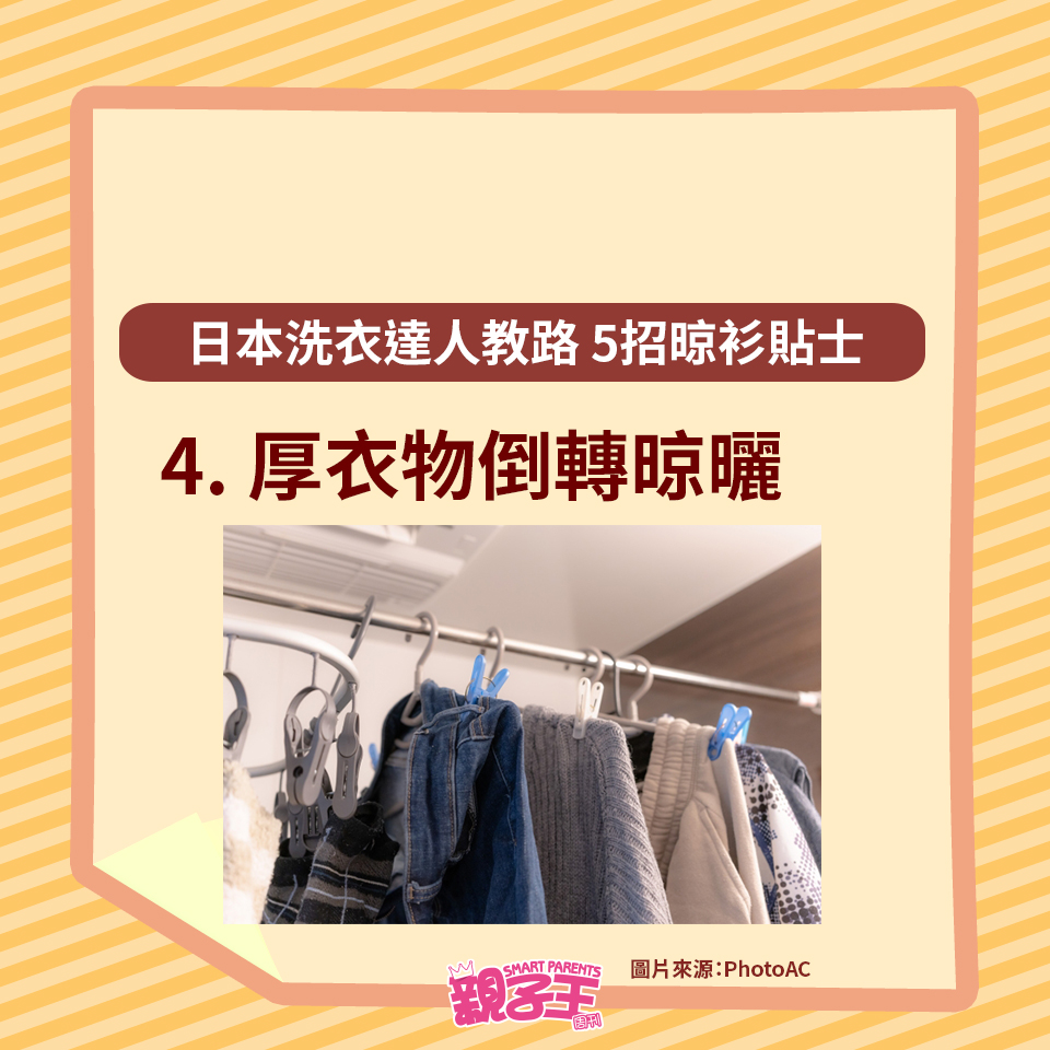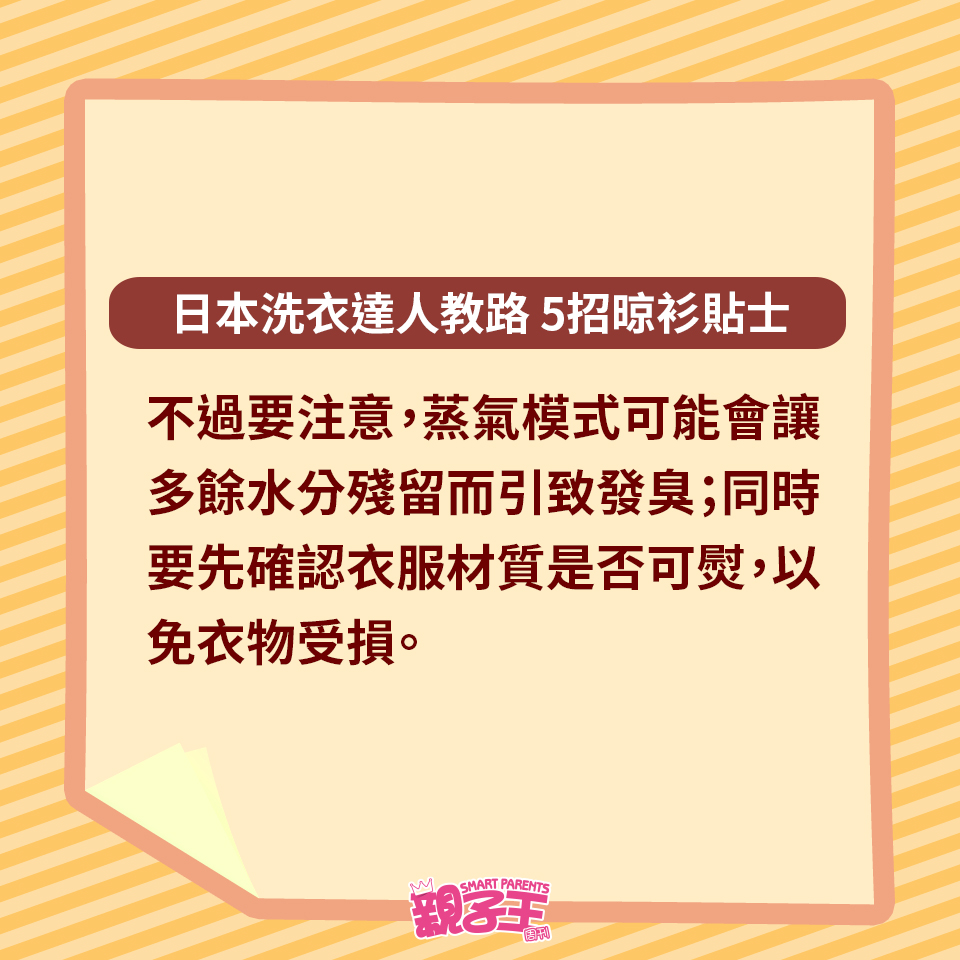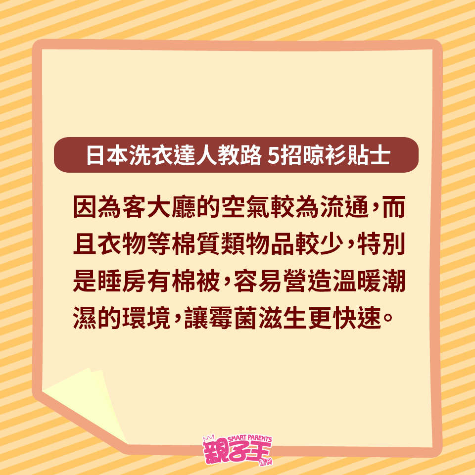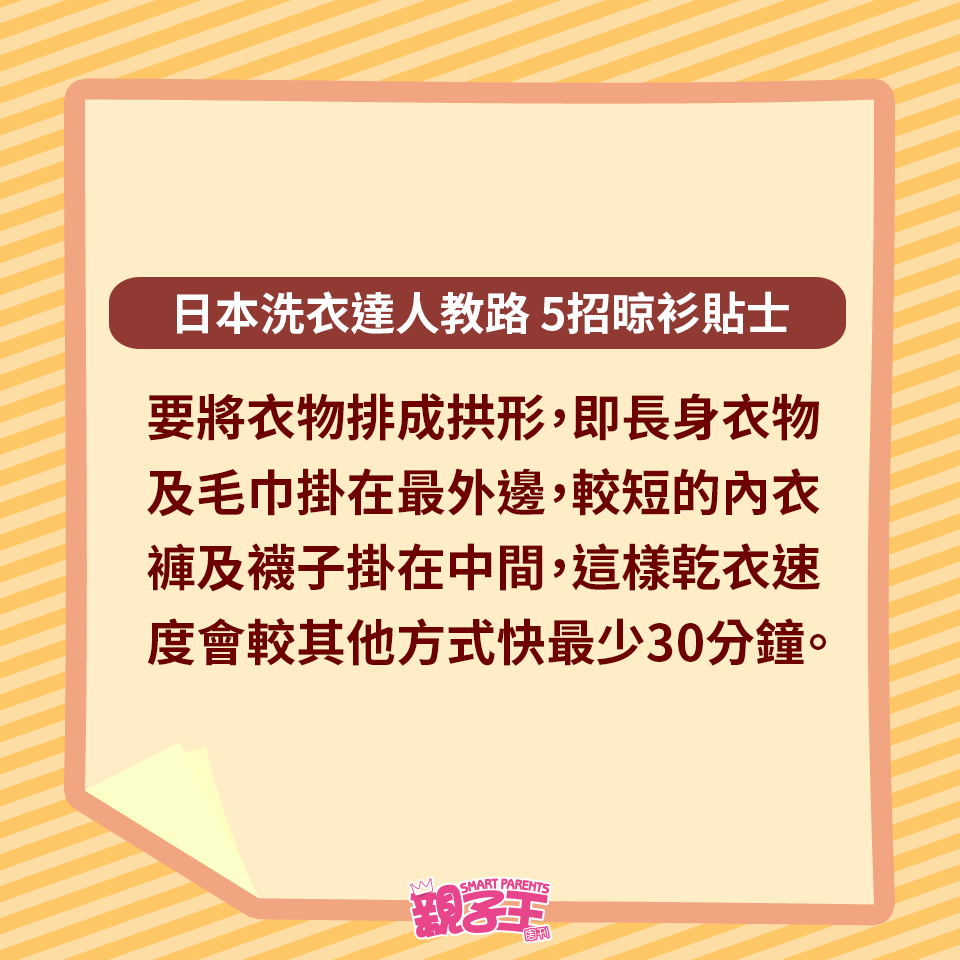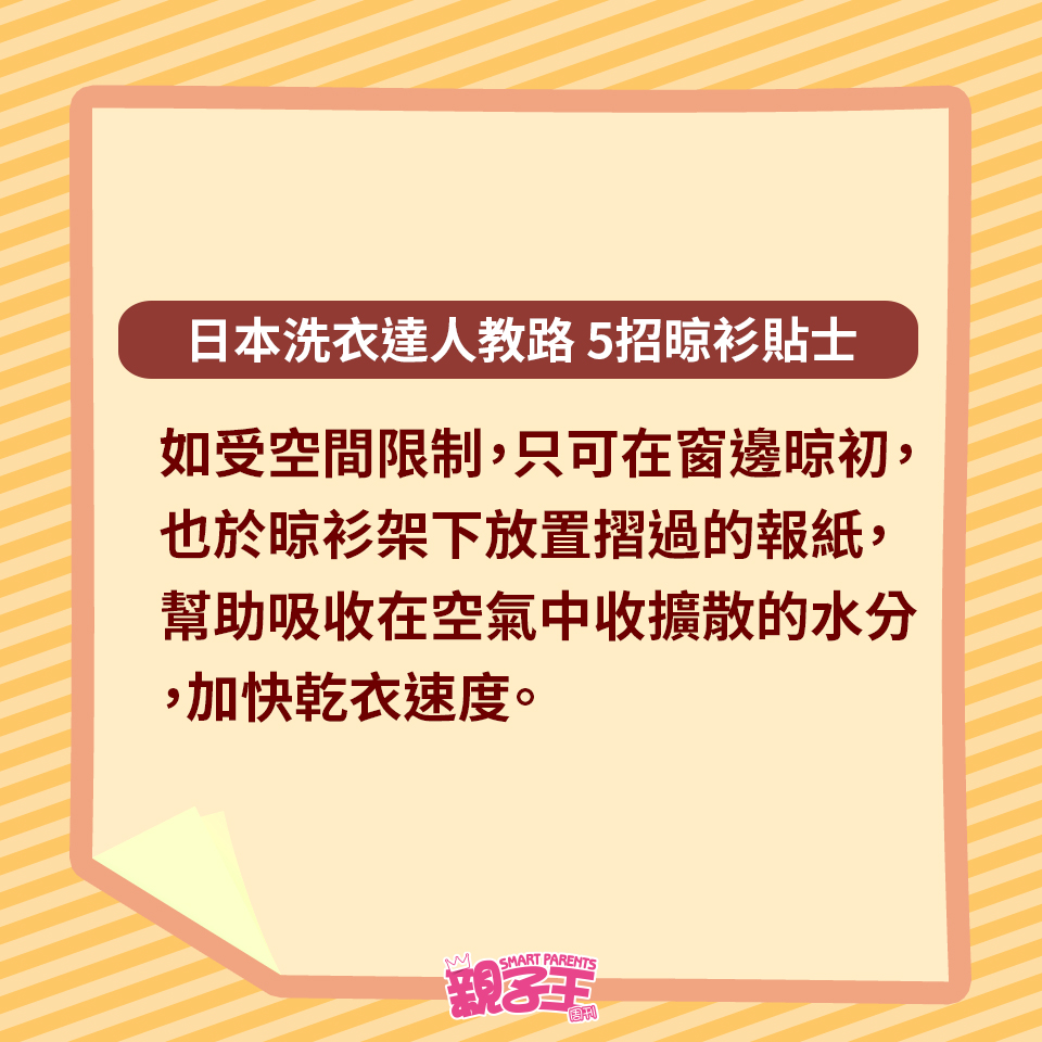 香港天文臺天氣預報顯示,這星期相對濕度天天達80%-95%以上!媽媽們就最討厭這種天氣,事關洗完衣服難以晾干,衣服又易滋生細菌而傳出難聞霉味。日本洗滌達人松延友記就教大家5招干衣晾衫貼士,令衣服在這個回南天時仍可盡快干透,減少霉菌量;而衣服干透后亦要學識日本家事達人每田祥子的4個衣服防潮濕法,衣服才可時刻保持干爽,保持氣味清新。