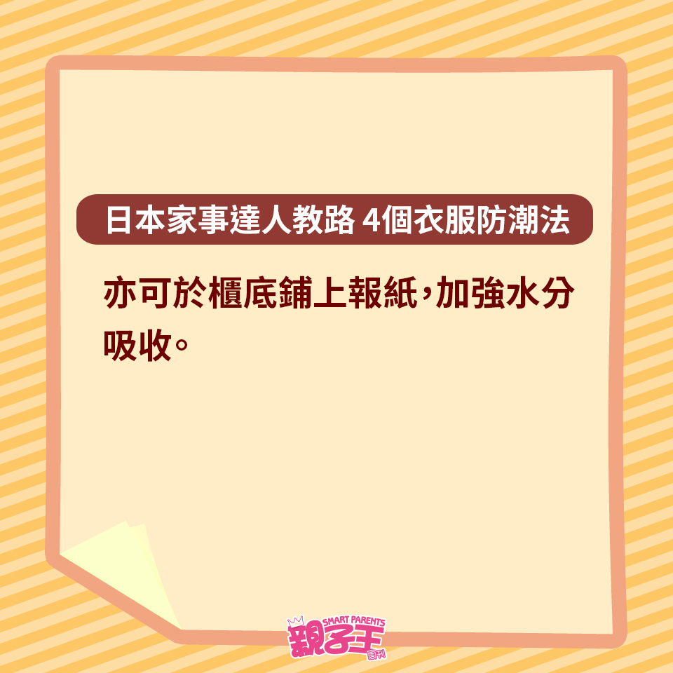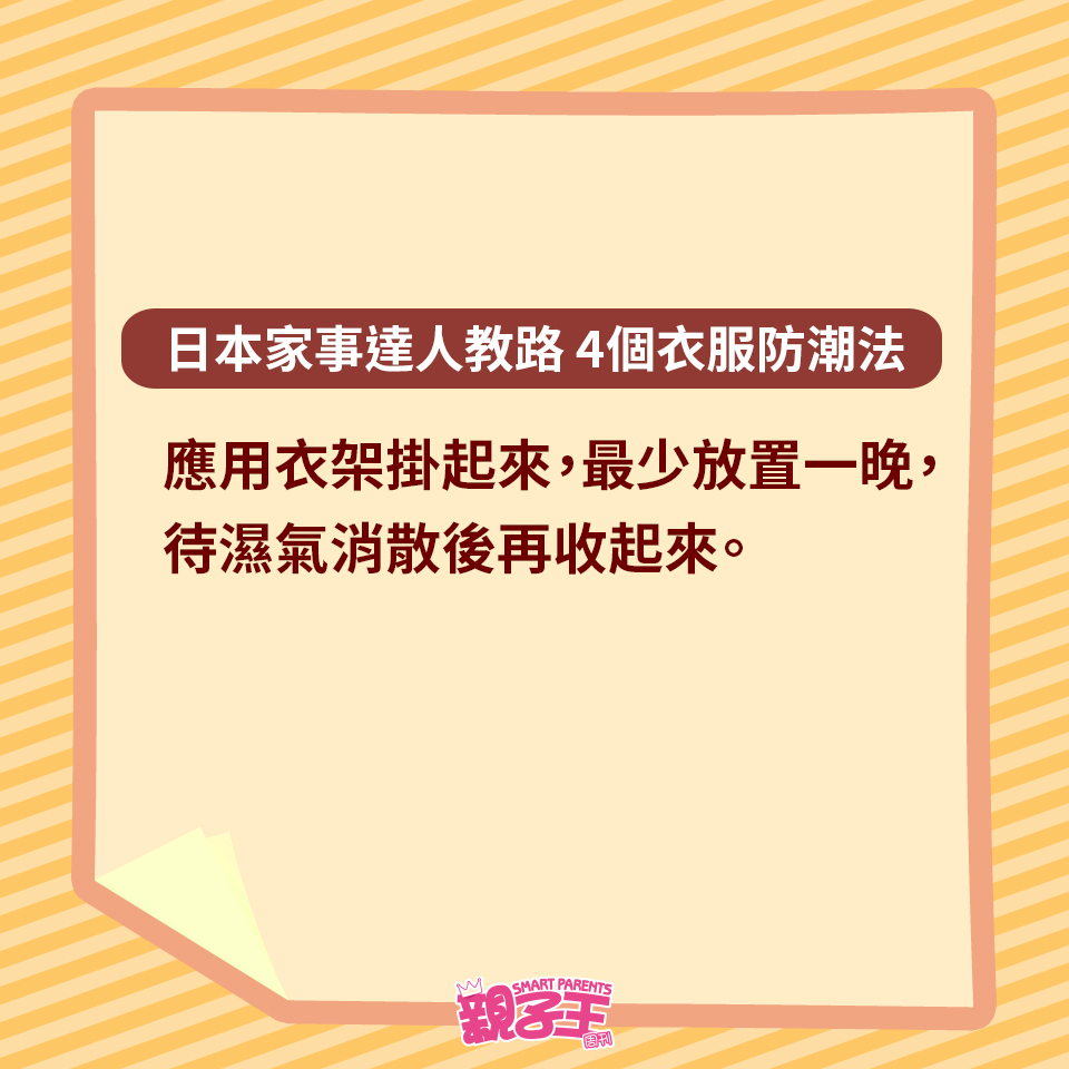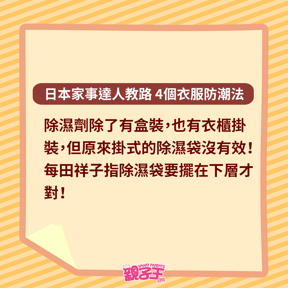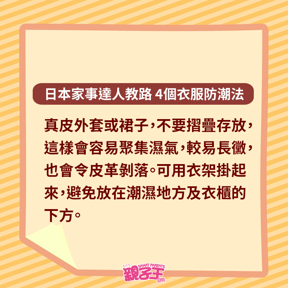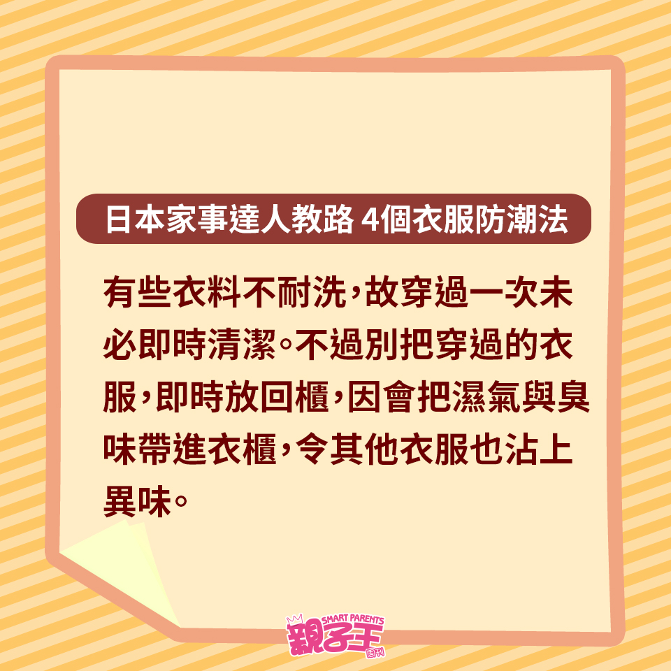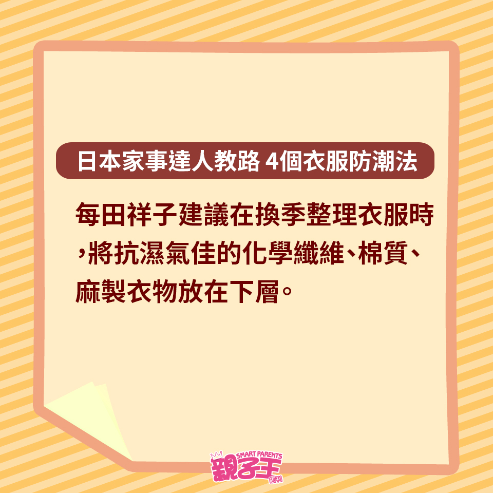 回南天除了晾衫困擾媽媽們,如果衣服收藏不當,衣柜或柜子更會有陣霉味。不想衣服出現霉菌黑點,日本家事達人每田祥子就教大家用以下4個方法收藏衣服,便有效趕走濕氣,更有助對付臭味及發霉元兇。