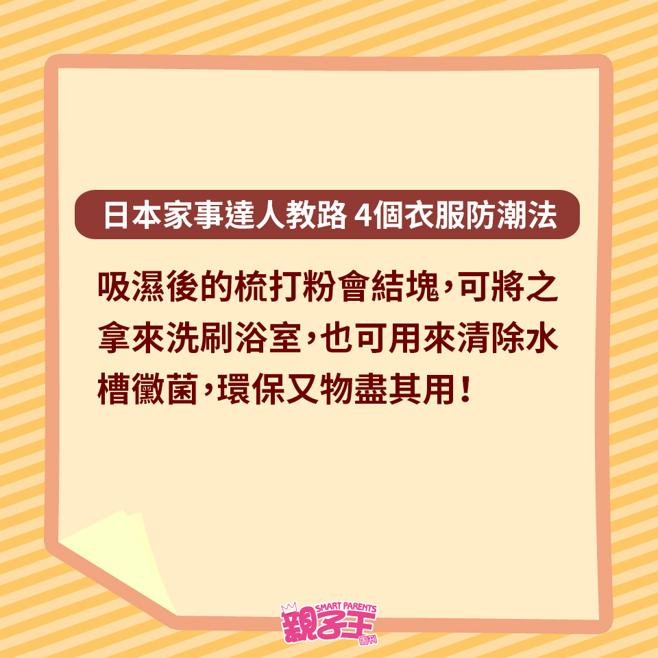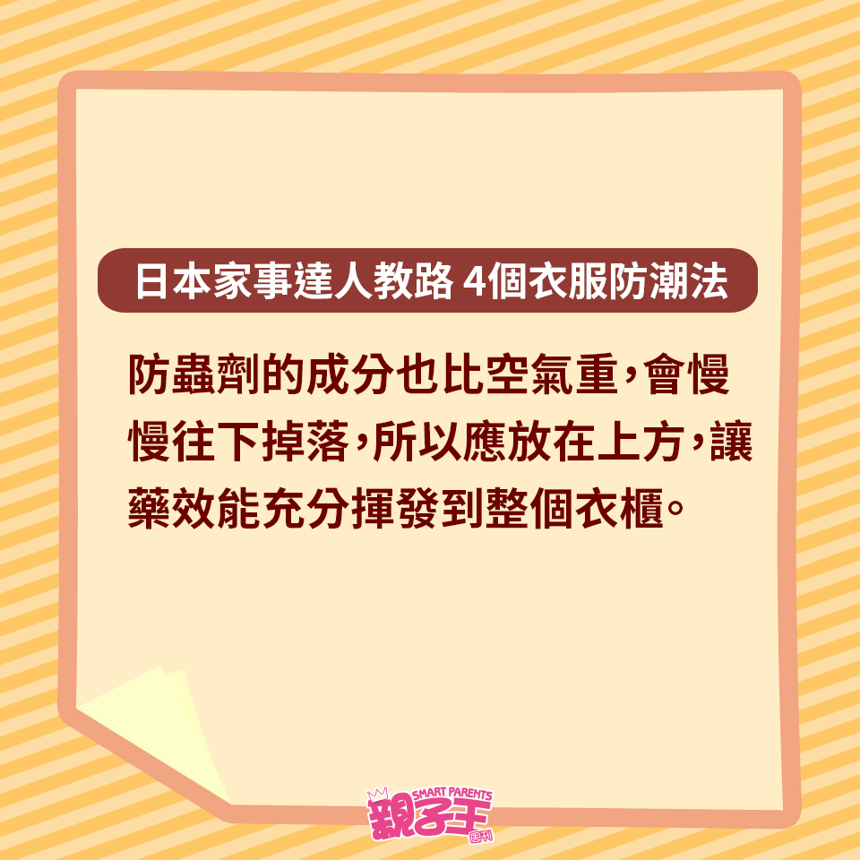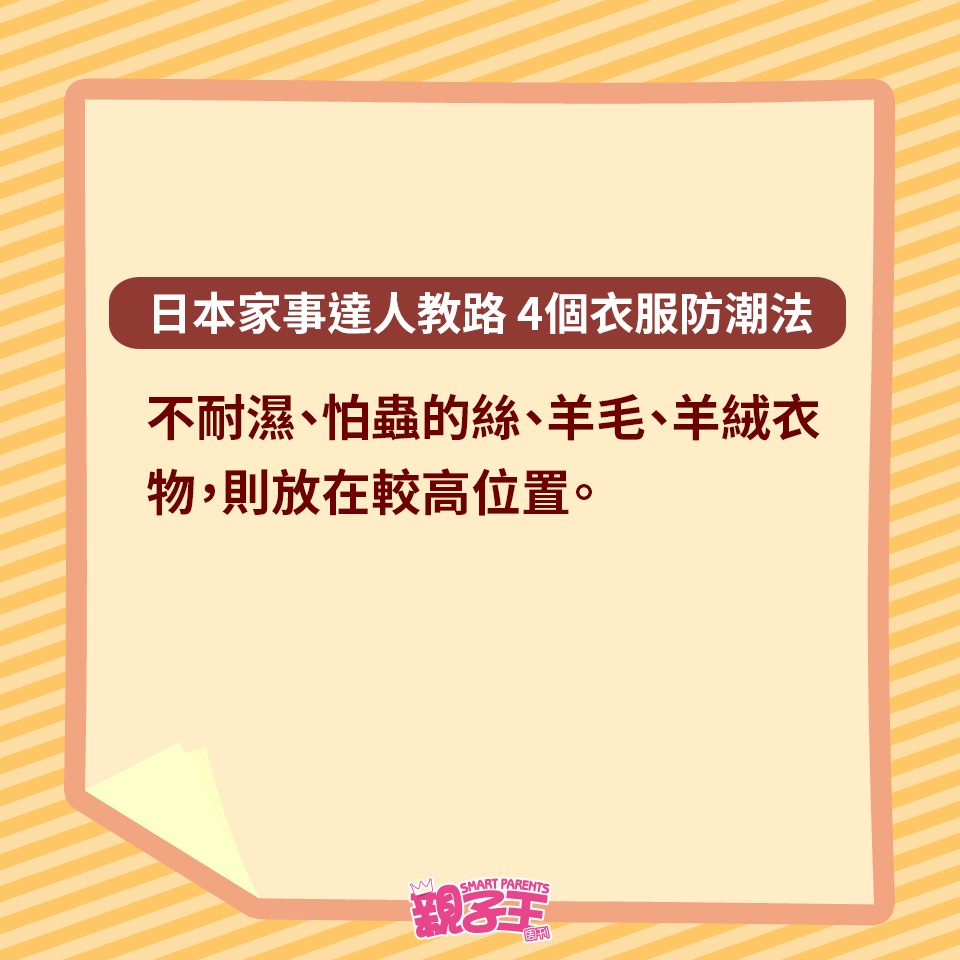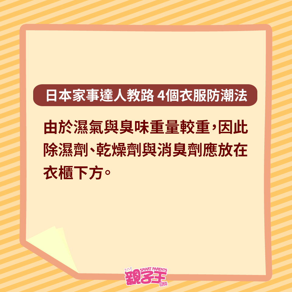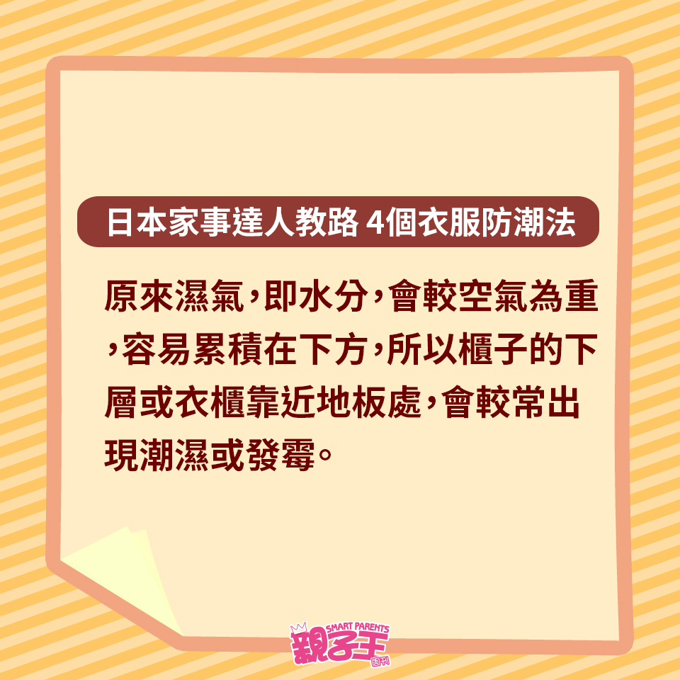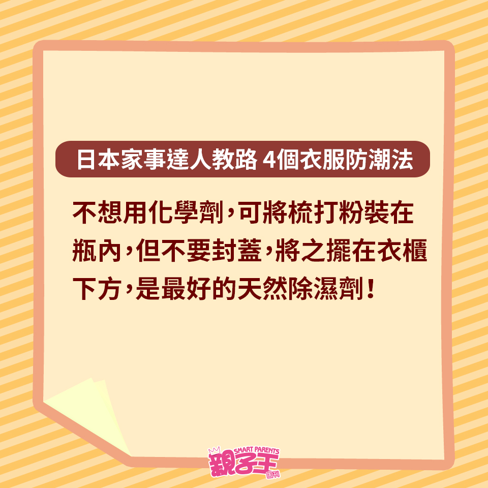 回南天除了晾衫困擾媽媽們,如果衣服收藏不當,衣柜或柜子更會有陣霉味。不想衣服出現霉菌黑點,日本家事達人每田祥子就教大家用以下4個方法收藏衣服,便有效趕走濕氣,更有助對付臭味及發霉元兇。