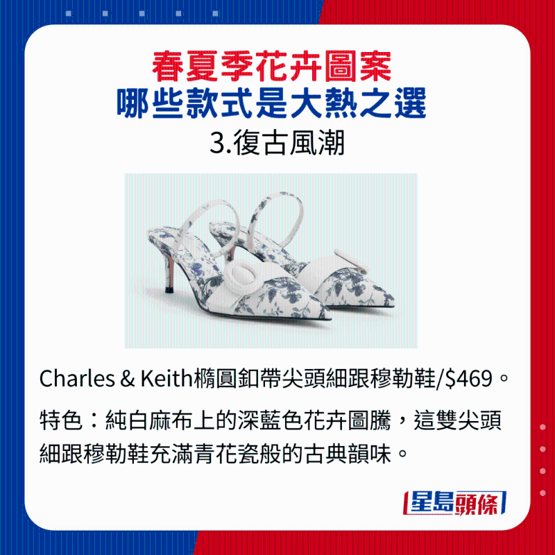Charles & Keith新推出的Mule Shoes及涼鞋,部分亦換上切合季節氛圍的花卉圖案。例如純白麻布制作的鞋身配以復古深藍或綠色花卉圖騰,再飾上橢圓形扣,典雅兼具女人味。Maje今季的設計主軸是向雋永迷人的巴黎時尚風格致敬,融入上世紀九十年代的元素,配搭流行的花卉圖案,展現新舊交融的吸引力。