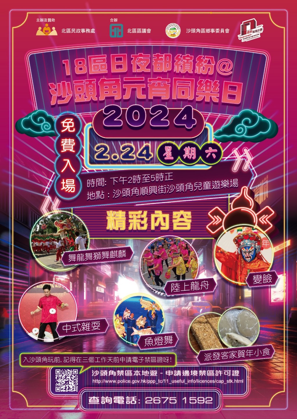 為配合沙頭角禁區開放舉辦的元宵同樂日。 活動場地會以花燈布置,并安排傳統表演如陸上龍舟舞、舞龍舞獅舞麒麟、變臉、魚燈舞等,以及派發客家賀年小食,透過節慶活動展示沙頭角傳統文化。