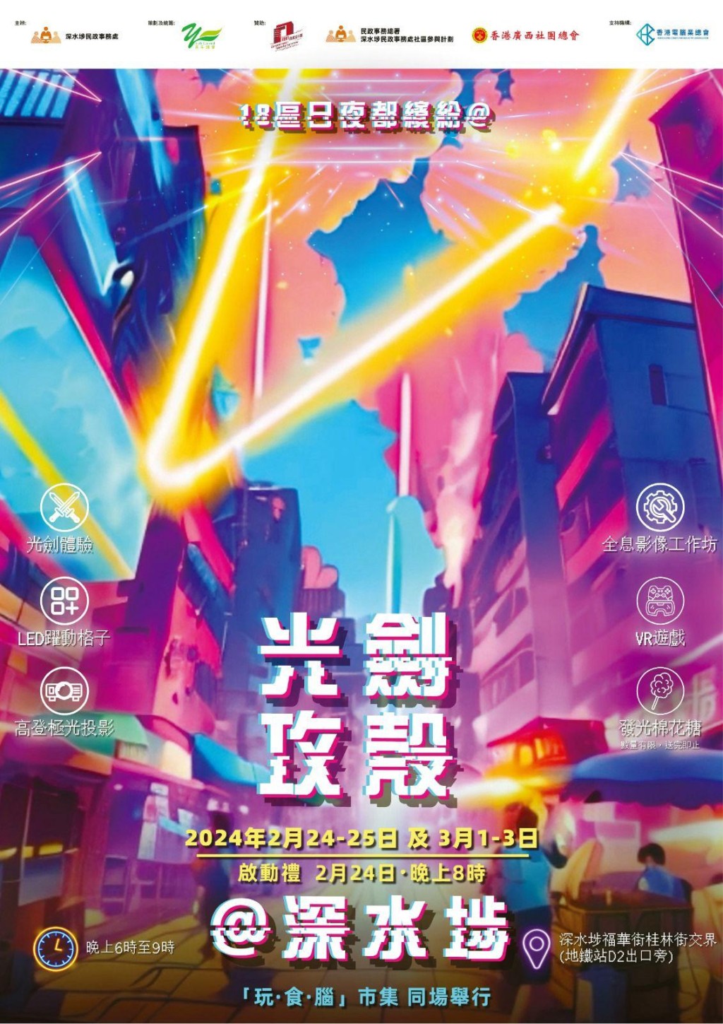 討論已久的“光劍攻殼@深水埗”確定舉辦時間,活動以動漫、數碼產品及新興運動光劍為主題,配以燈光裝置、游戲及其他夜光活動等,聯合區內商鋪及食肆,以游戲攤位、 適當布置及折扣優惠吸引市民及游客到訪深水埗,振興深水埗夜經濟。