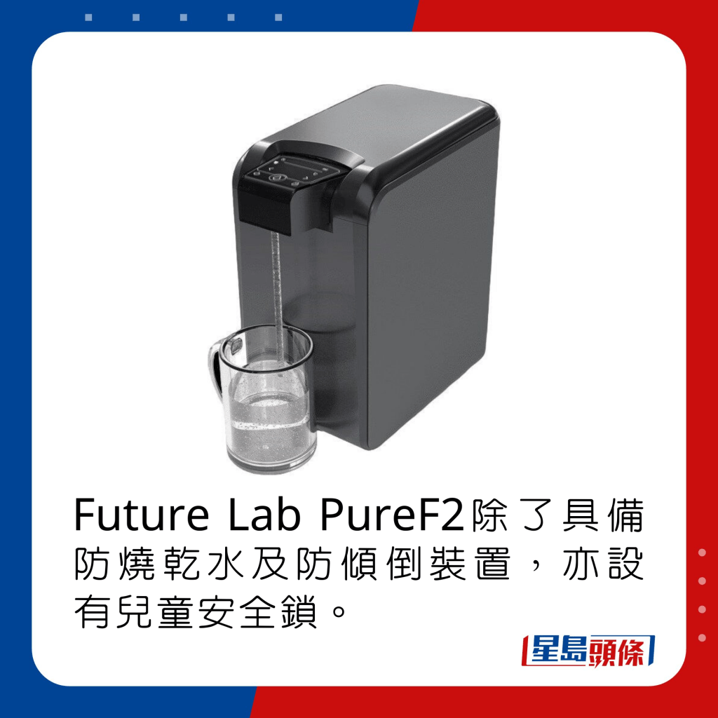 PureF2貫徹品牌的創新風格,主機竟然可以拆出來,重量只有500g,放入行李篋帶著出差旅行都不成問題,且以配合不同轉插頭及連接管,還可直接插入瓶裝水,甚至桶裝水,容量可以隨時變大縮小。除了具備防燒干水及防傾倒裝置,PureF2亦設有兒童安全鎖,確保安全。