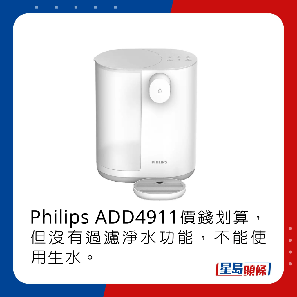 ADD4911功能較少,水箱容量只有2公升,但勝在價錢劃算,可以直接斟出95℃、85℃及45℃的熱水,以及常溫水,且設有安全鎖,當出水溫度高于45℃即會自動開啟,留要此機沒有過濾凈水功能,不能使用生水。