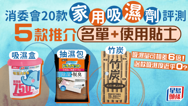 消委會于第534期《選擇月刊》測試了 20 款家用吸濕劑樣本,當中一半為盒裝,主要成分為氯化鈣,另外有 3 款小型吸濕包、2款大型掛裝吸濕袋、2款硅膠防潮珠以及3款竹炭或活性炭,平均每包/盒價錢由$4至$42.3不等。