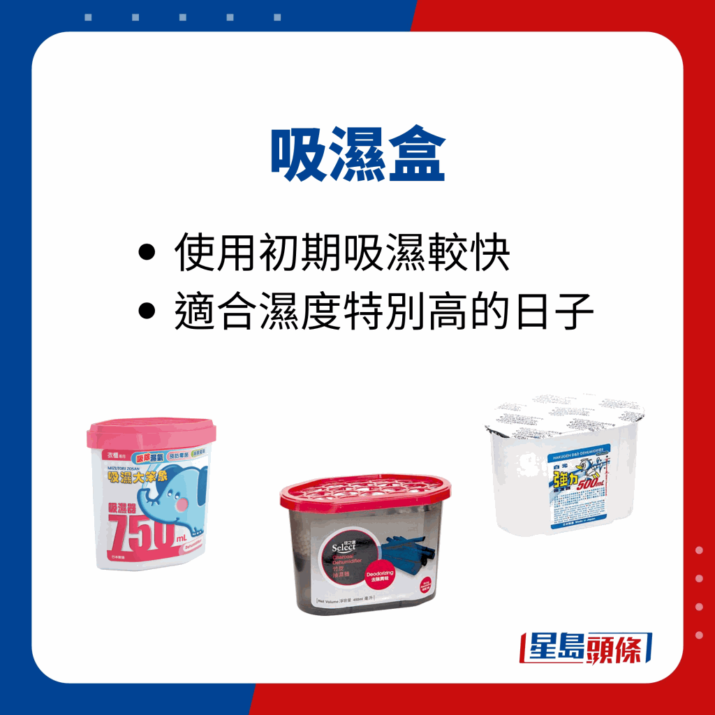 回南天空氣潮濕,香港天文臺預枓未來9天相對濕度將維持70%至95%的高水平。要對付潮濕天氣,除了使用抽濕機或長開冷氣機,亦可以將吸濕劑放置于衣柜、鞋柜及儲物柜中,幫助除濕防霉。消委會過去曾測試吸濕大笨象、白元、日本城、實惠等巿面上20款家用吸濕盒、吸濕掛袋及竹炭包,發現各樣本的吸濕量、速度等效果懸殊,某些樣本的吸濕效能更近乎零。即睇消委會推介名單及使用小貼士!