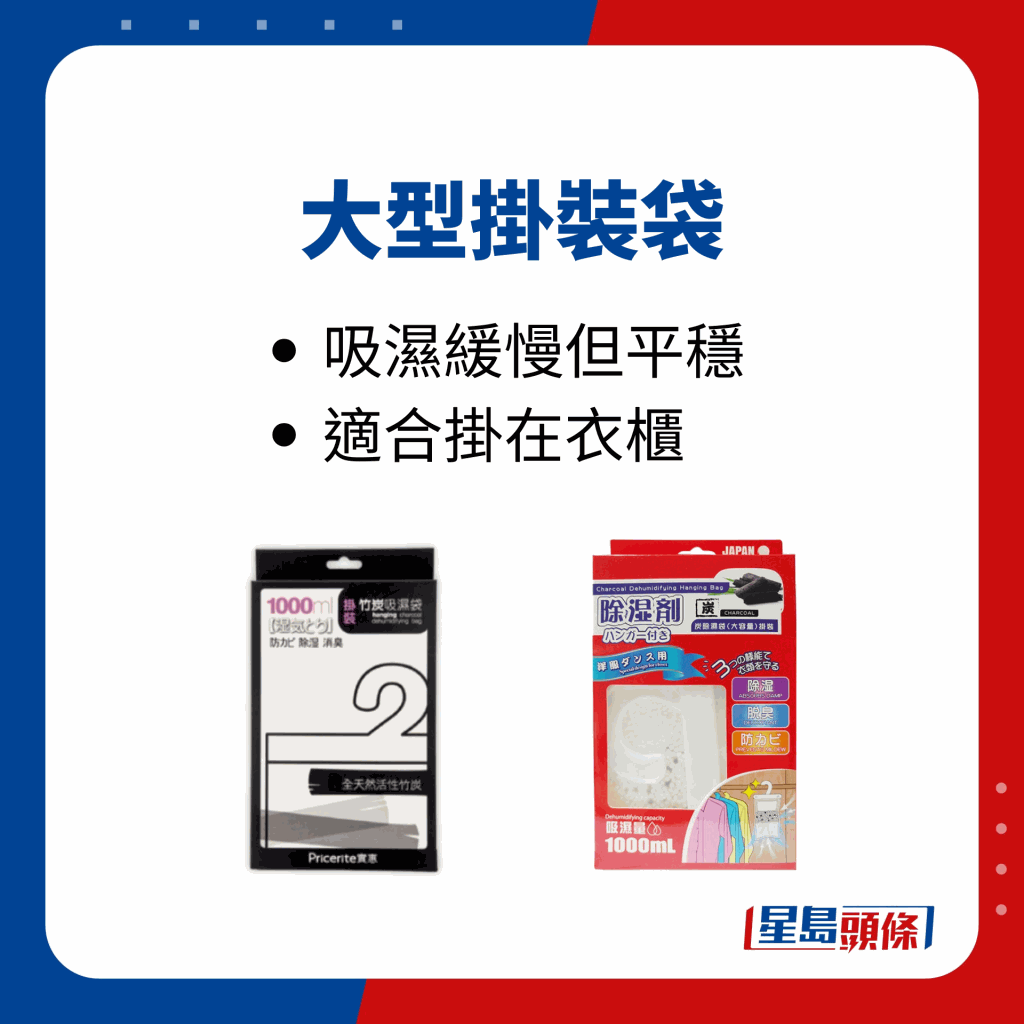 2、衣柜、衣箱或鞋柜等較大的空間,易選用盒裝吸濕劑。