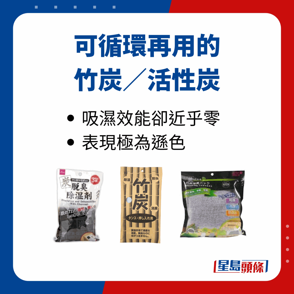 另外有四款樣本獲4.5星高分,分別是“Topvalu Bestprice 除濕劑($18/3盒裝)”、“3M強力吸濕器($63/6盒裝)”、 “Goodmarks炭吸濕啫喱抽屜除濕包($12/5包裝)”及“白元強力驅塵螨抽濕袋(花香味)($85/12包裝)”。 當中“Goodmarks炭吸濕啫喱抽屜除濕包”平均每包只需$2.4,性價比甚高。