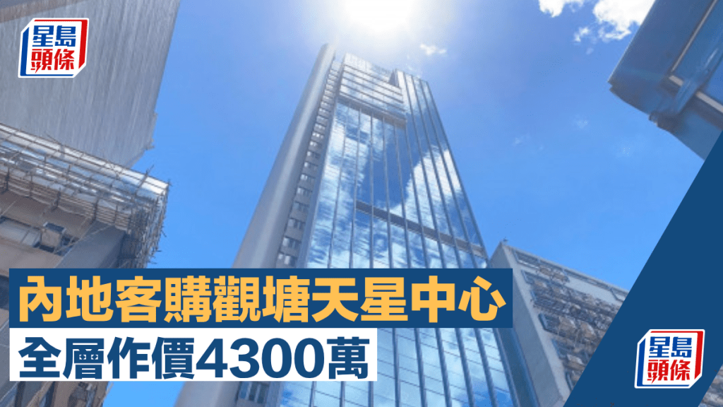 利嘉閣工商部分區董事文啟軒指,觀塘鴻圖道35號天星中心中層全層樓面,建筑面積約5,687方呎,原業主以4,834萬放售,最終減至以4,300萬售出,平均呎價7,561元,買家為內地客,是次透過公司名義入市。