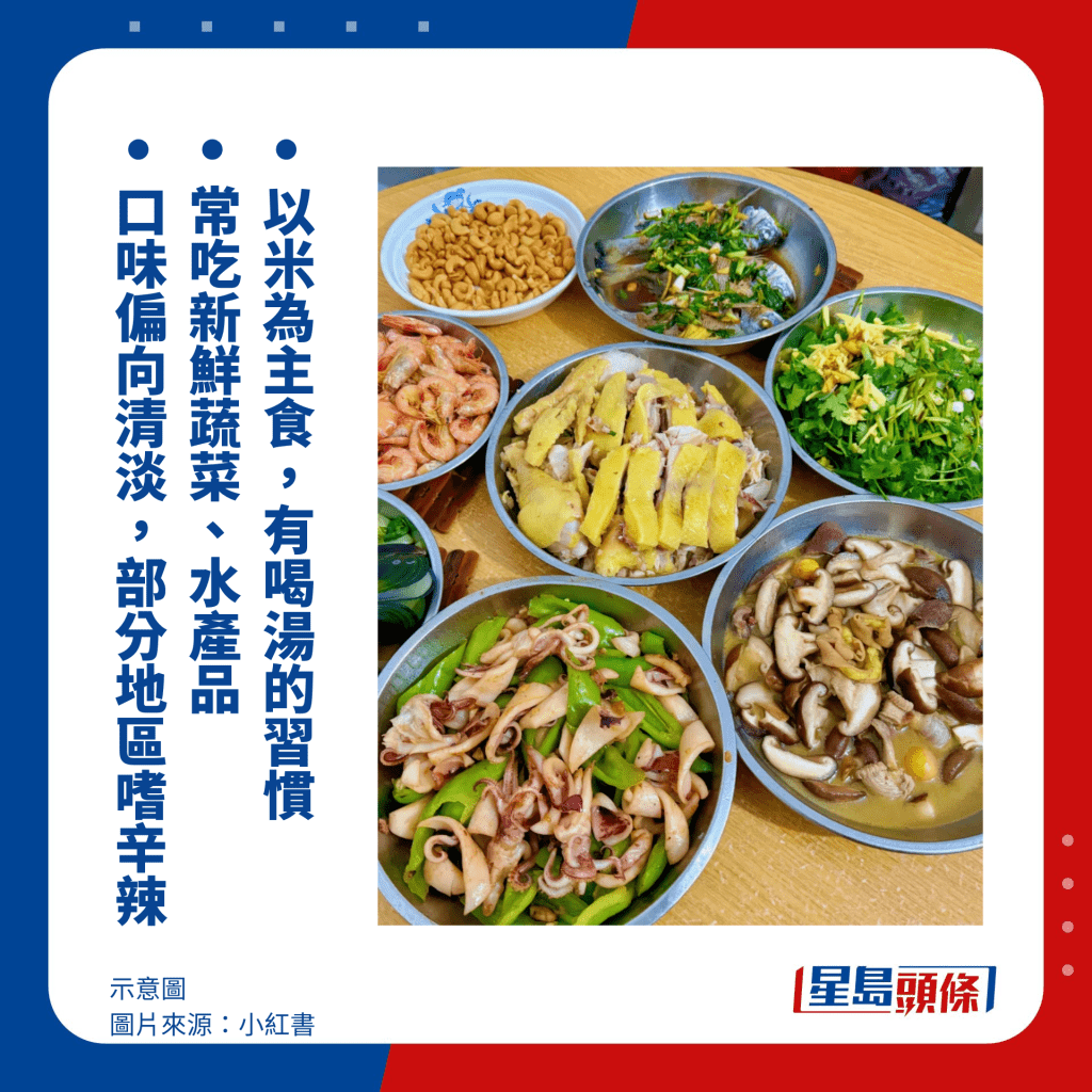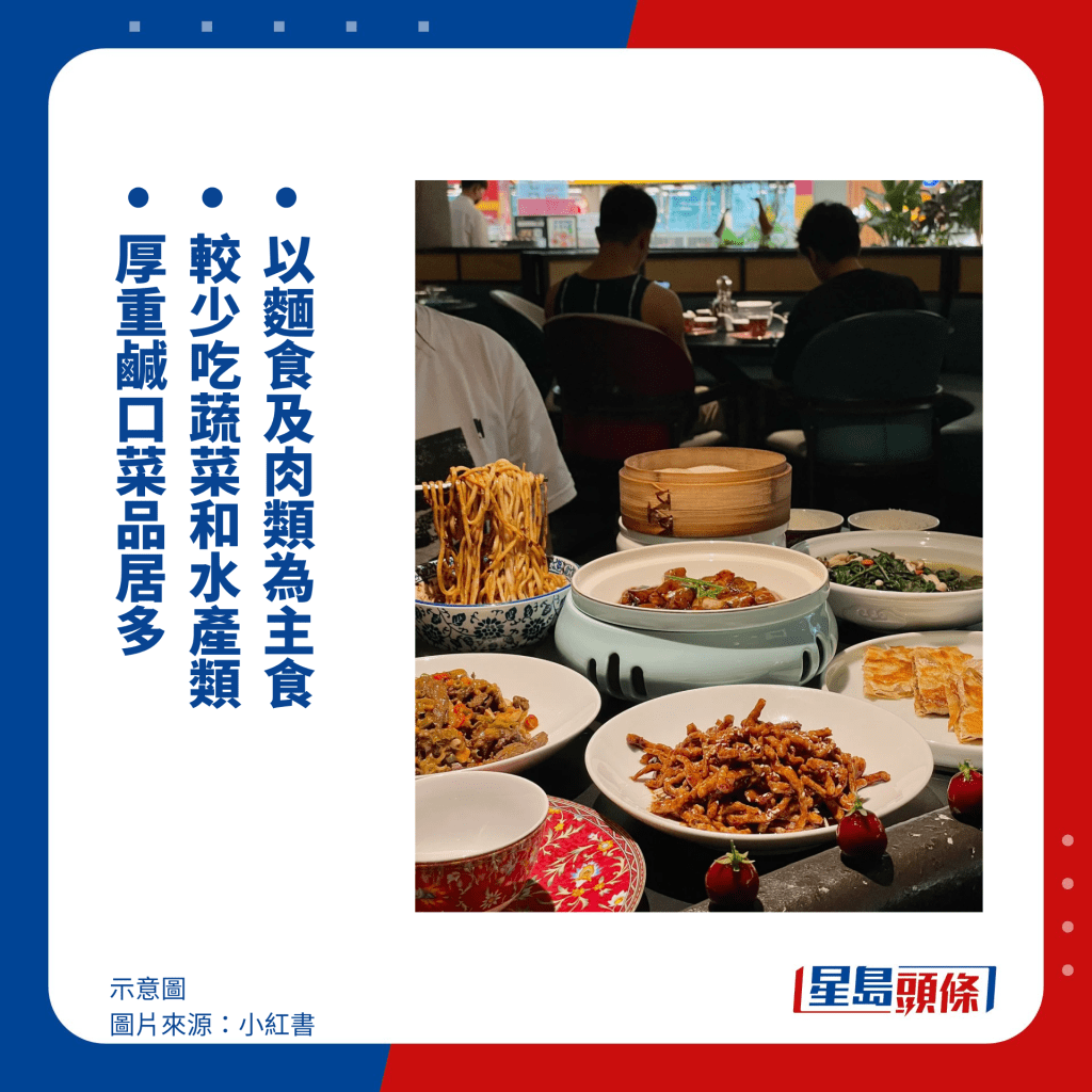 衛健委指食譜以“尊重傳統飲食文化,保留特色飲食”為宗旨,例如東北地區以米面、燉菜及肉類為主食,著重味重色濃,食譜搭配鐵鍋燉魚、饅頭、小雞燉蘑菇等地道菜式; 華南地區主食則以米飯、湯水及蔬果為主食,食譜挑選了蕃茄豆腐湯、木耳蒸雞等。