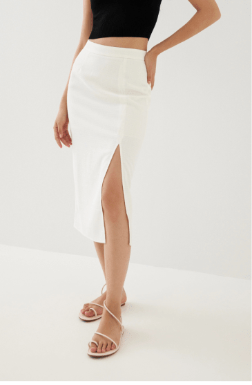 ▲Love, Bonito的Alissa白色半截裙/$329,裙身以高衩設計。
