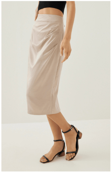 ▲Love, Bonito的Nindan色丁半截裙/$329,裙側採用打摺細節。