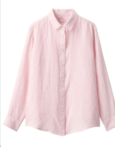 ▲無印良品Muji女裝洗水恤衫/$228,粉紅色衫身飾以白色條紋配以透氣的亞麻布料。