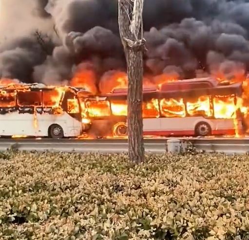 根據現場民眾拍下的影片顯示,前方的巴士及后方的旅游巴車體完全燃燒,竄出的黑煙直沖天際,由于火勢過于猛烈,一旁開過的車輛趕緊迅速駛離,避免受到波及。