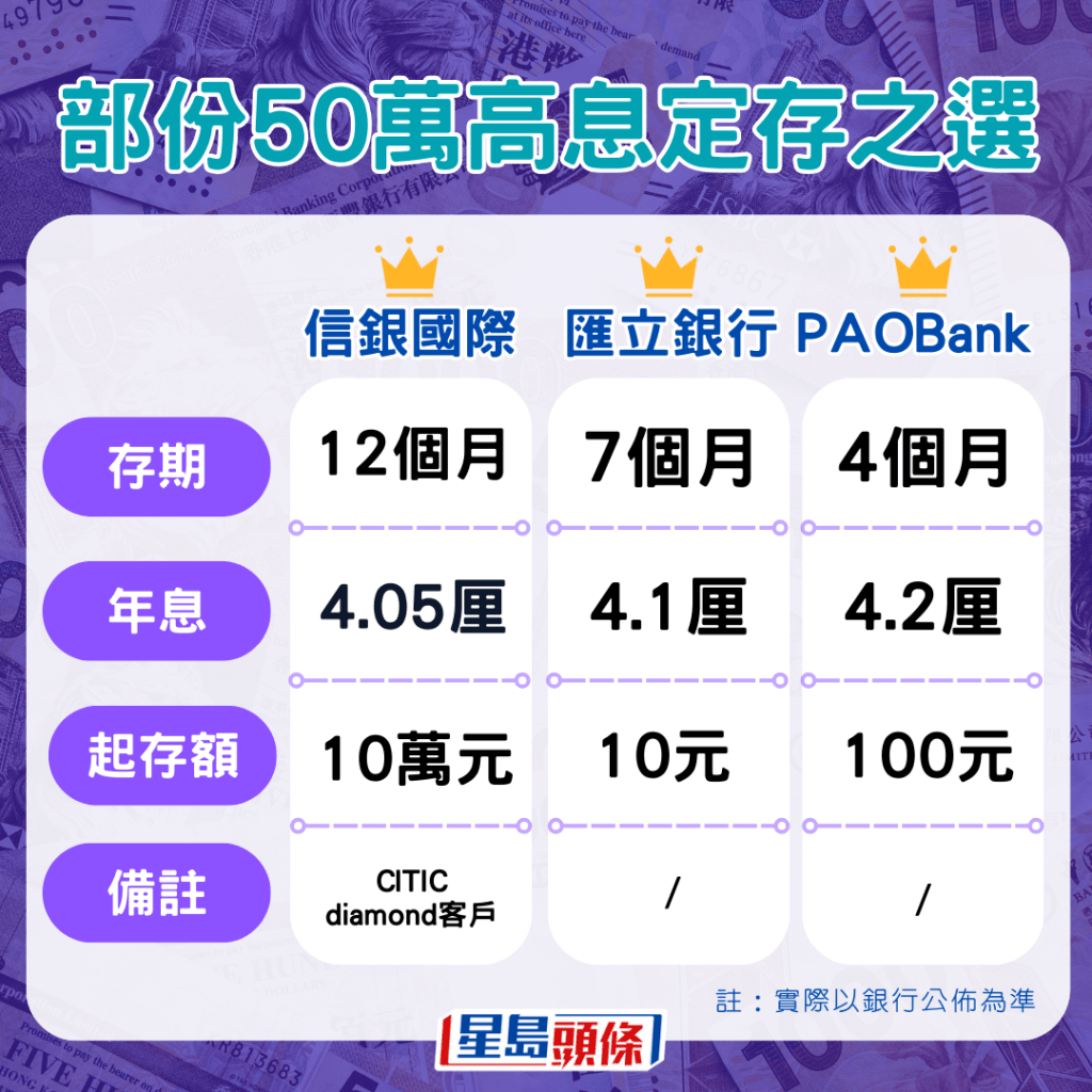 要數目前市場利率最高的定存,仍然是花旗銀行3個月年利率5%,即獲6,250元,惟需為全新私人客戶業務戶口,并要持有指定產品結存。若是全新Citigold客戶也有4.8厘,3個月速賺6,000元。