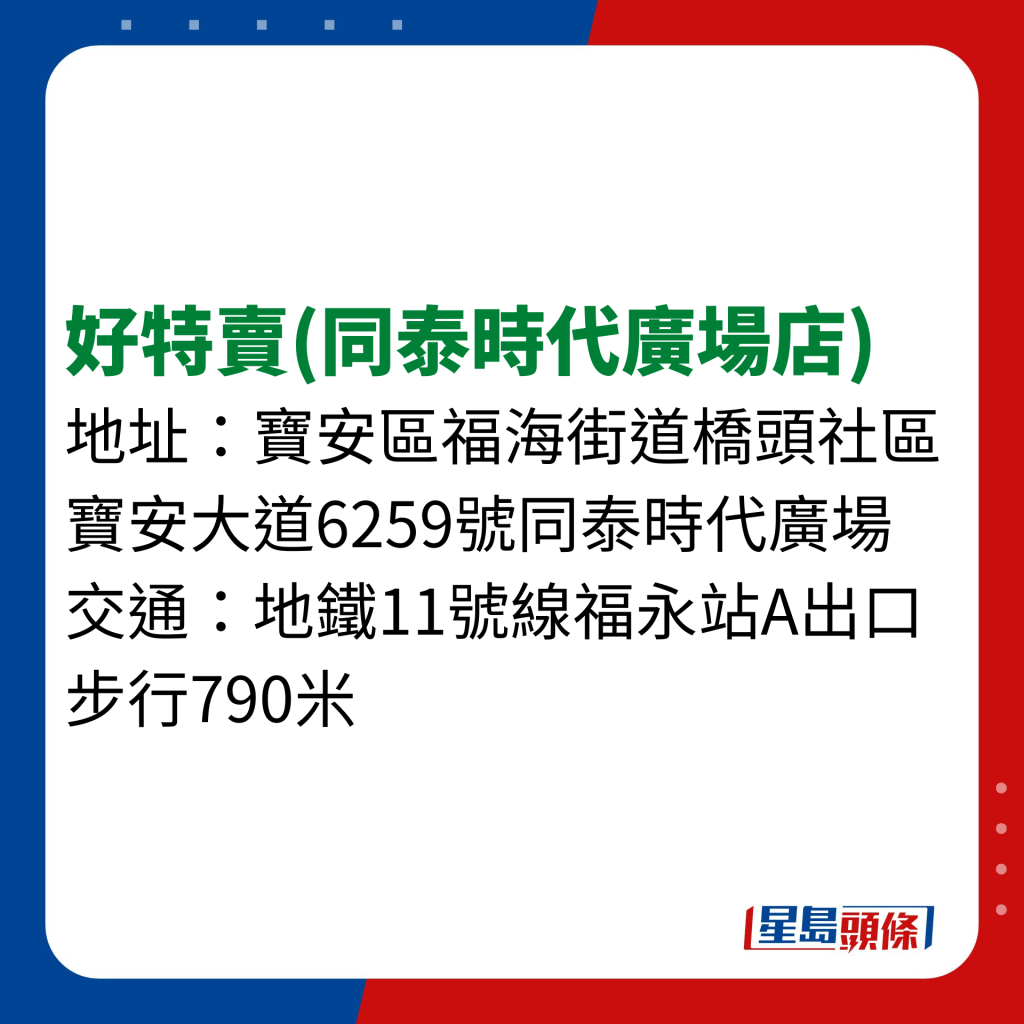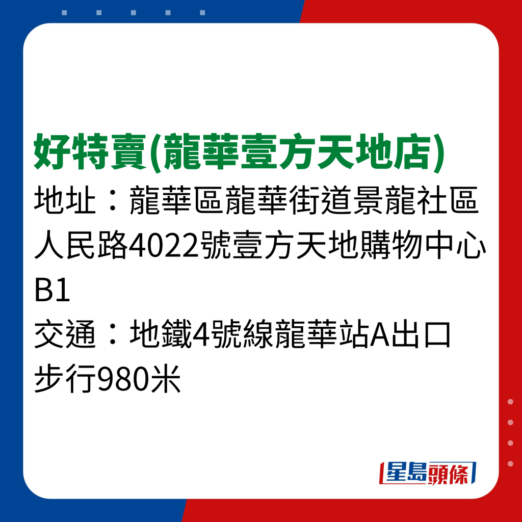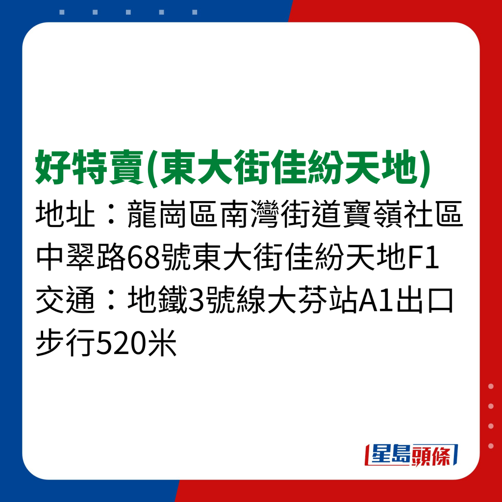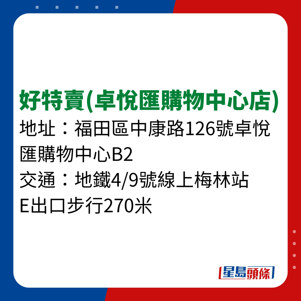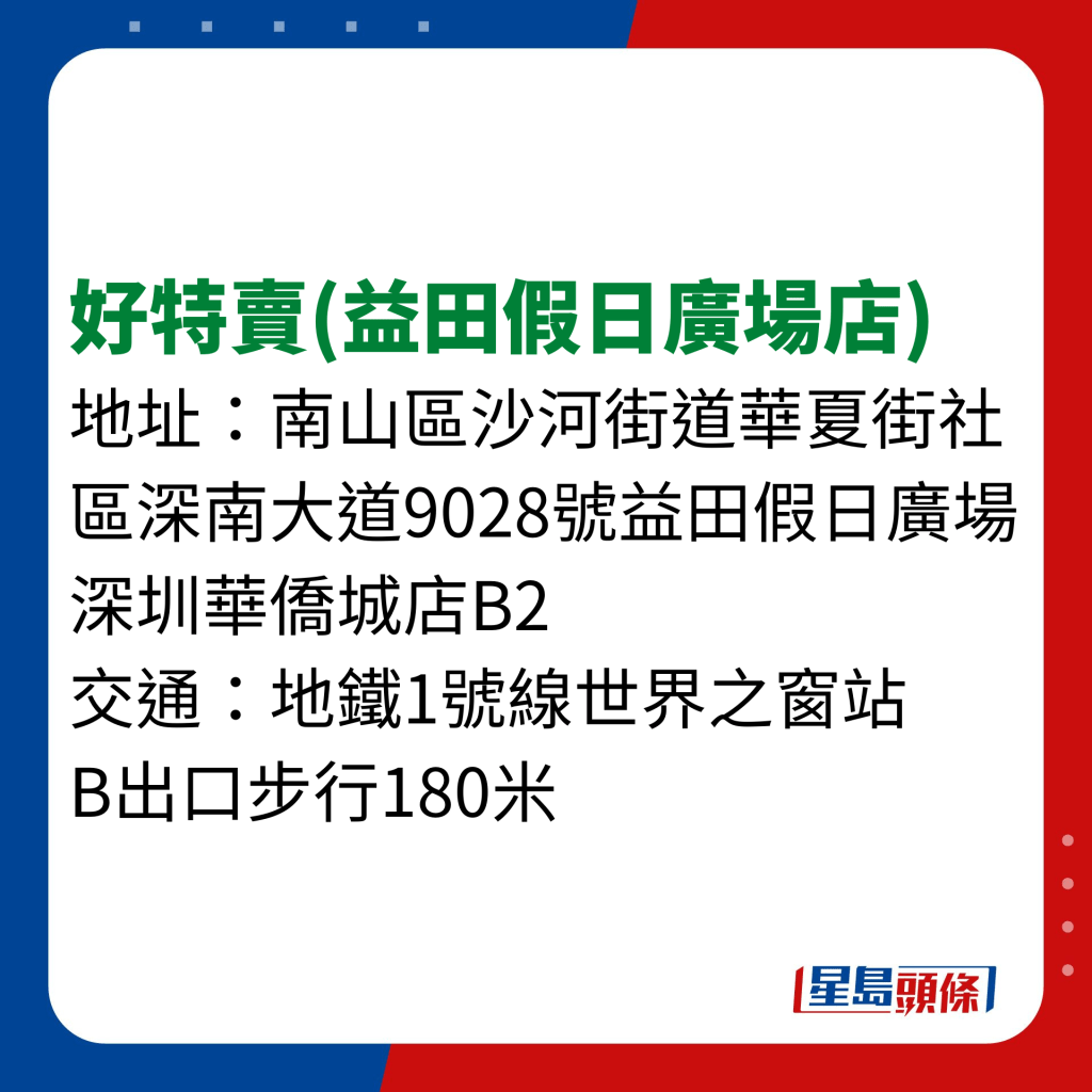 “好特賣HotMaxx”是一家國內知名超市連鎖品牌,在深圳有多間分店,提供各類型的食品、生鮮食材、家居用品、日用品、玩具等等?!昂锰刭u”非常注重價格競爭力,經常舉辦促銷活動和特價優惠,定價低廉,有不少貨品低至 ¥1、¥2 起即有交易,所以大受港人歡迎。有港人近日就在Facebook討論區分享對“好特賣”的熱愛,更形容為“每次上深圳只要經過依間鋪就會入去行個圈,就算無嘢(就算沒東西)要買,入去買支(瓶)水都好”,幾近上癮。
