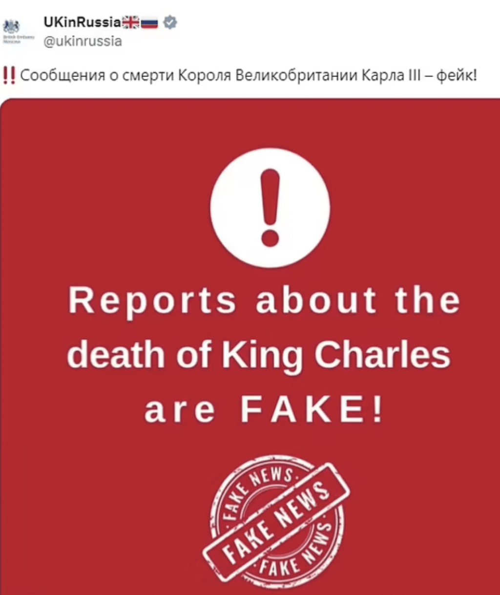 多家俄羅斯媒體周一錯誤引述網上消息,指英王查理斯三世于周日意外去世,其后更新報道,指是虛假訊息。英方不敢輕忽,查理斯辦公室和英國駐莫斯科大使館等即日發聲明澄清,指“查理斯仍在履行職務”,粉碎“駕崩”傳言。