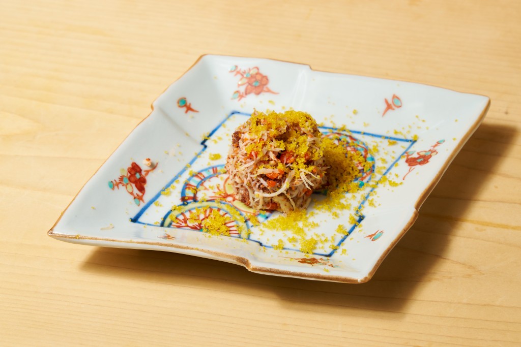 鮨. 齋藤的Omakase盛宴,由時令酒肴開始,明石產八爪魚經時慢煮,口感柔韌有勁,經醬油、黑糖及日本酒腌漬,引出海味。 另一道香箱蟹, 手拆蟹肉加入蟹籽及蟹膏,配上炙燒烏魚子,咸香鮮美,水份亦無過份流失,實屬水準之作。