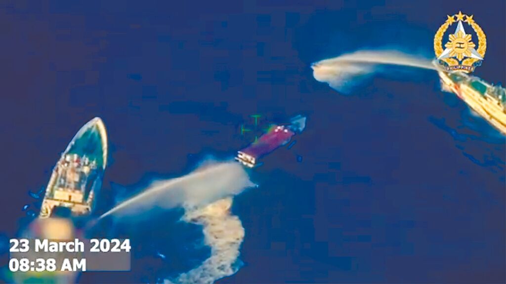 ▲菲國軍方公布的影片顯示,補給船Unaizah May 4在阿云金淺灘附近遭到兩艘中國海警持續的發射水炮驅趕。(摘自Armed Forces of the Philippines官網)