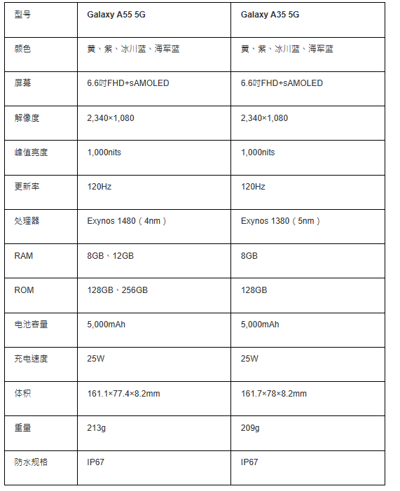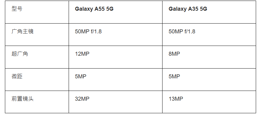 最后一個分別來自RAM容量,Galaxy A55 5G的256G版本配備12GB RAM,Galaxy A35 5G兩個版本都只有8GB RAM。