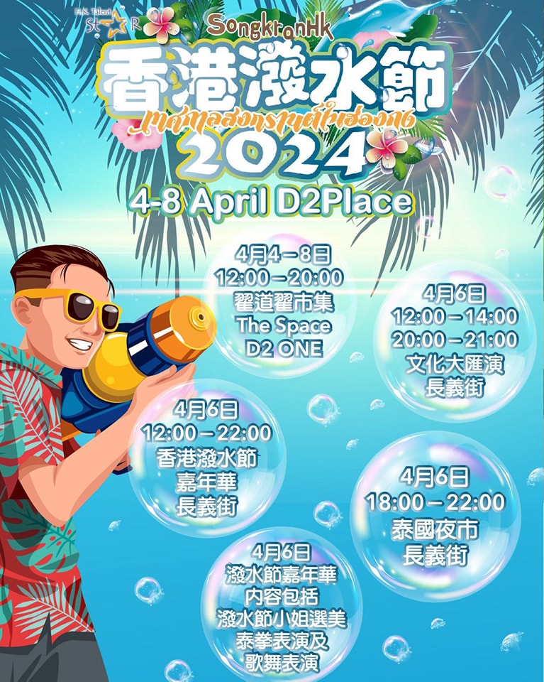 為慶祝泰國傳統節日“潑水節”,香港都有多個潑水節活動,除了在有“小曼谷”之稱的九龍城舉辦“龍城美食潑水‘泰’繽紛”嘉年華外,荔枝角亦將于4月上演“香港潑水節2024”,到時不但有重頭戲潑水環節,大家更可免費入場參與泰國特色市集、泰式按摩、街頭小食、拳王表演,想感受熱鬧氣氛的大家記得留意地點、日期!
