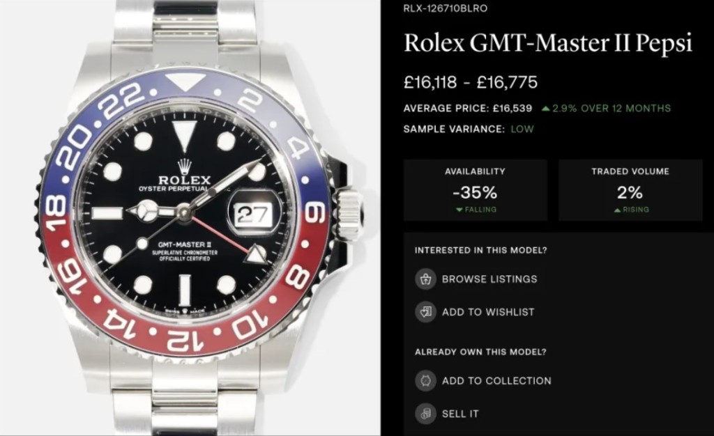 雖然新百事圈GMT-Master II仍在生產,表迷仍可以在零售店購買,但北美最大線上腕表轉售網站之一Bob's Watches網站顯示,“Pepsi”部分開價2.2萬美元以上,幾乎是零售價10,700美元的一倍。