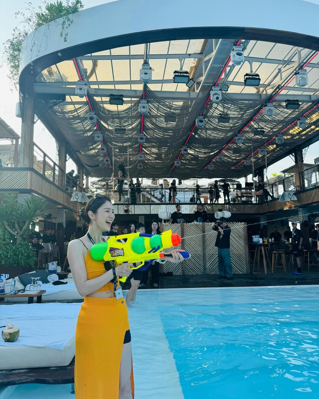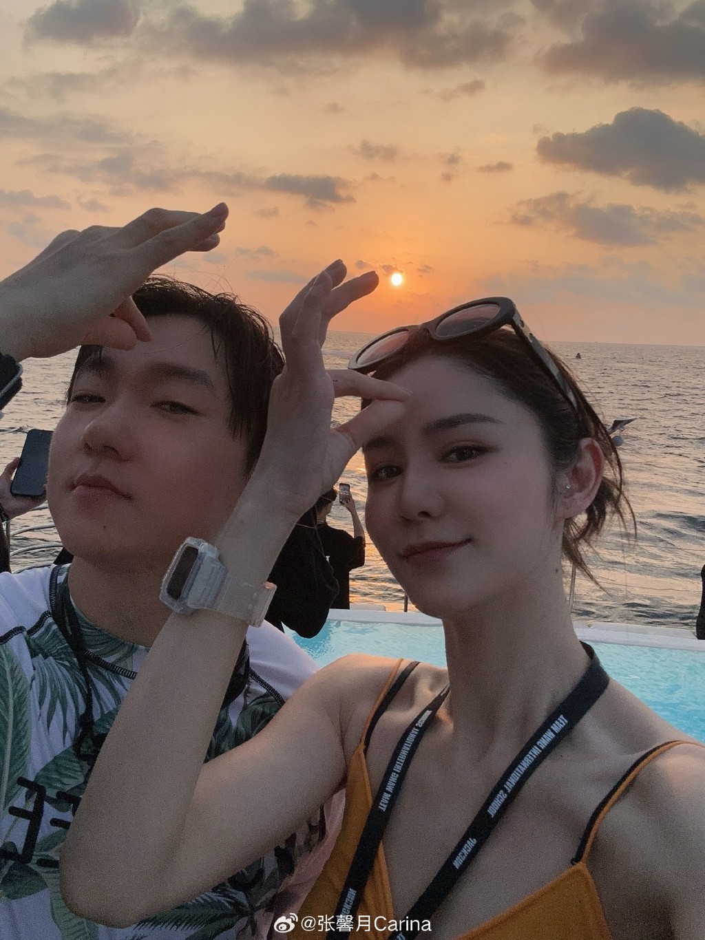 張馨月近日在多個不同社交網分享多輯照片,只見她穿上一件橙色吊帶上衣,露出一條小纖腰,下身雖然穿上同款同色長裙,但露出一邊白滑長腿,非常吸睛。這位人妻更于泳池邊玩水槍,而在泳池中同樣手持水槍的,則是韓國男團GOT7成員王嘉爾,之后張馨月更曬出兩人頭貼頭的合照,陳敏之見到兩人的合照都留言指好羨慕,而張馨月則回覆回來再聚。此外,當一艘寫上“HBD JACKSON”的游艇駛近時,張馨月更大派心心。原來這輯照片是早前王嘉爾在28日慶祝30歲生日,在布吉大開派對所拍。