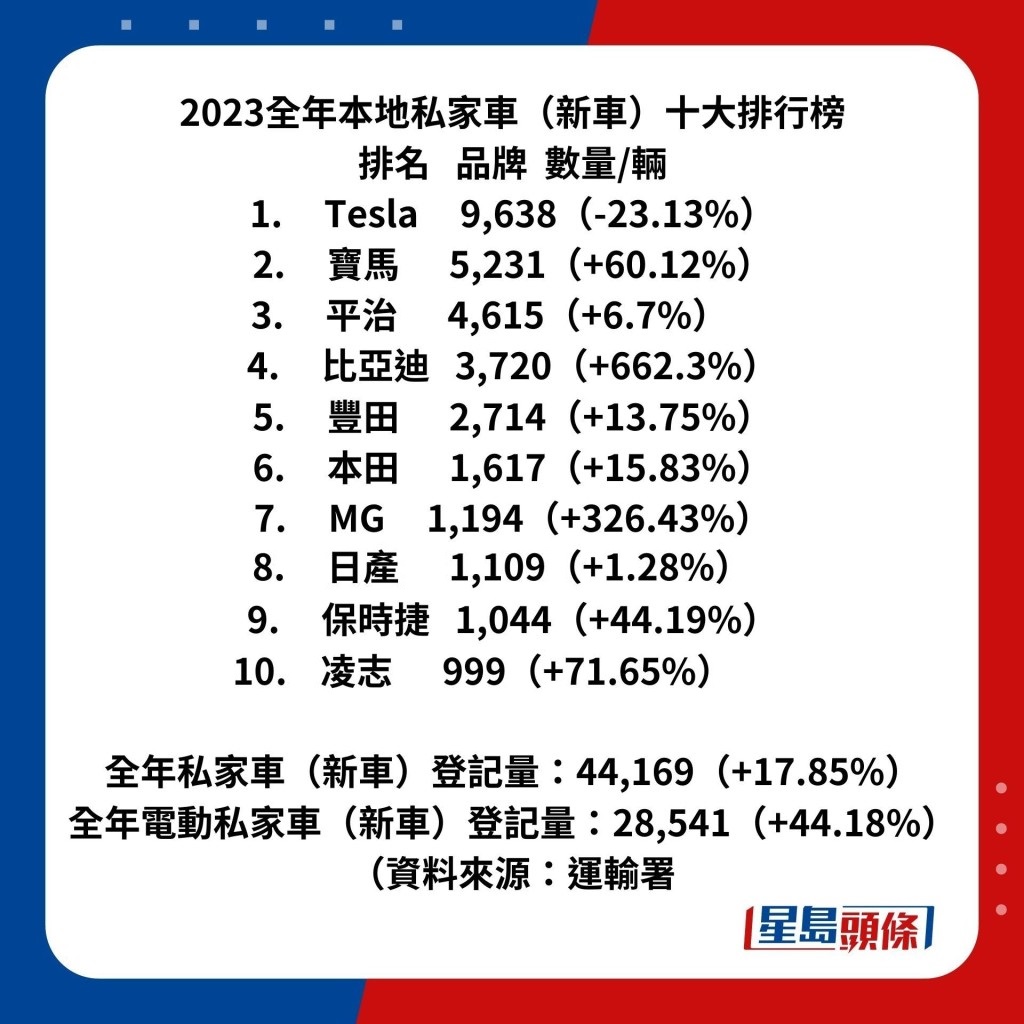 香港經濟復蘇緩慢,低迷市道令各行各業備受壓力,尤幸汽車零售業逆流而上,新一年開局理想。 也許受惠港車北上熱潮帶動,以及電動車“一換一”計劃年初尚未公布延續緣故,刺激整體交投量持續增長。 踏入2024年1月份,Tesla新車登記數字是953輛,雖比去年12月下降12.8%,依然排名首位。 隨著新款Model 3大貨陸續抵港交付,據聞品牌在2月份的交投量將進一步上揚,而車廠早前再以震撼價推出Model 3入門后驅版,預期銷量可節節上升,其他對手想要超越,需加倍努力了。 國產電動車比亞迪(BYD),去年同期曾壓倒Tesla首登排行榜第一位。 今年好夢未能重溫暫列第2位,惟品牌月內錄得900輛交投量,較去年12月勁升84.05%兼創記錄新高,表現毫不失禮。 因應“一換一”新稅制,廠方已于4月1日起調整全線車系售價,確保市場競爭力。 平治(Mercedes-Benz)與寶馬(BMW)各以344輛及296輛分列第3位和第4位,兩者登記量較去年12月同見回落,但德國“雙B”年初表現向來慢熱,預期往后將迎頭趕上。 豐田(Toyota)以267輛排名第5位,首款電動車bZ4X將陸續到港交付,深信有助爭取佳績。