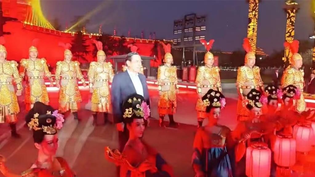 馬英九一行晚餐后,在大陸國臺辦副主任仇開明陪同下,游覽西安城墻。馬英九與一群盤著發髻、身著深V低胸古裝的演員合影,饒有興致的詢問她們身上穿的是哪個朝代的服裝?導覽員答:唐代的。馬英九還詢問古代西安城墻是否有守軍?并對護城河水深、城墻建筑、防御工事等問題感到好奇。