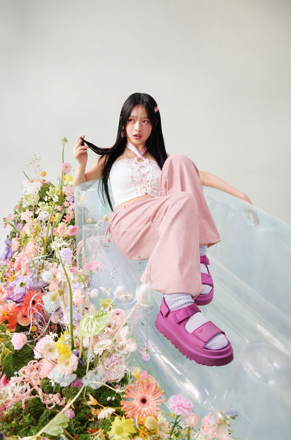 ▲UGG品牌大使Hanni身穿白色拼粉紅色掛頸上衣及粉紅色松身長褲,襯以品牌Golden Glow厚底涼鞋,塑造Tone-on-tone動感型格。