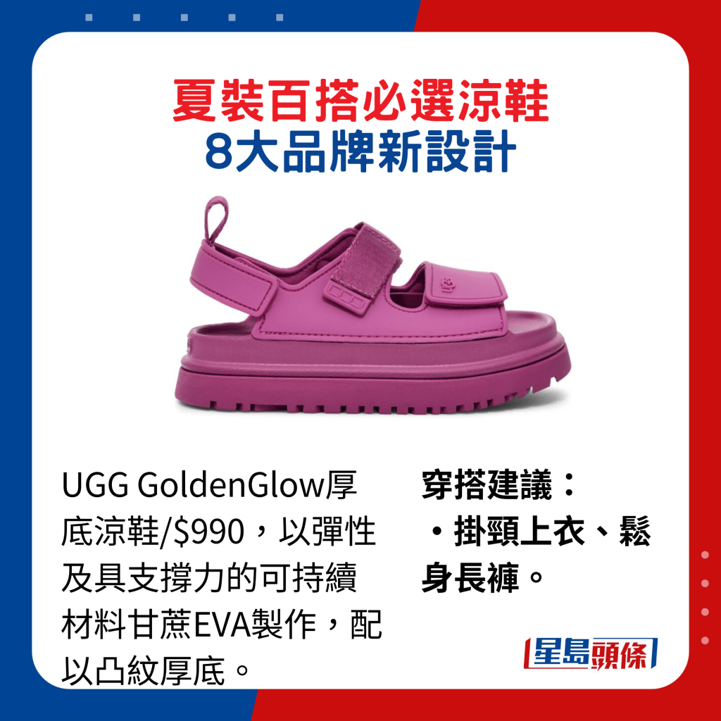 ▲UGG GoldenGlow厚底涼鞋/$990,以彈性及具支撐力的可持續材料甘蔗EVA制作,配以凸紋厚底。穿搭建議:掛頸上衣、松身長褲。