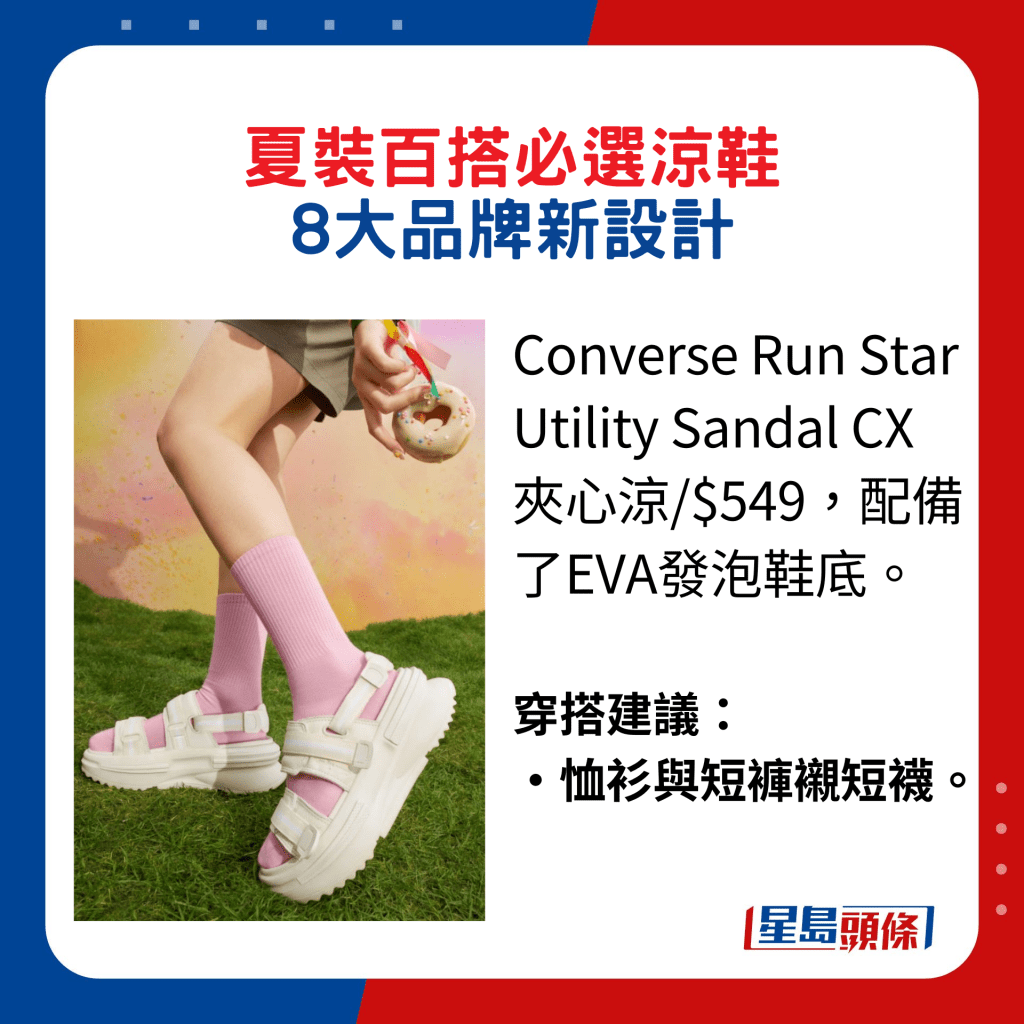 輕松又易穿易襯的T恤、背心、短裙、熱褲及松身長褲等夏裝單品,配以一雙休閑厚底涼鞋最理想。今季不少新設計都主打環保,好似圖中為人氣韓國女團NewJeans成員Hanni所穿的UGG粉紅色GoldenGlow,正是采用可持續材料甘蔗EVA制作,并以凸紋厚底設計,環保又舒適。她配襯白色拼粉紅色掛頸短身上衣及粉紅色松身長褲,塑造活潑型格。另一款Stratus版本則在鞋身及搭帶大玩對比色設計,同樣搶眼。