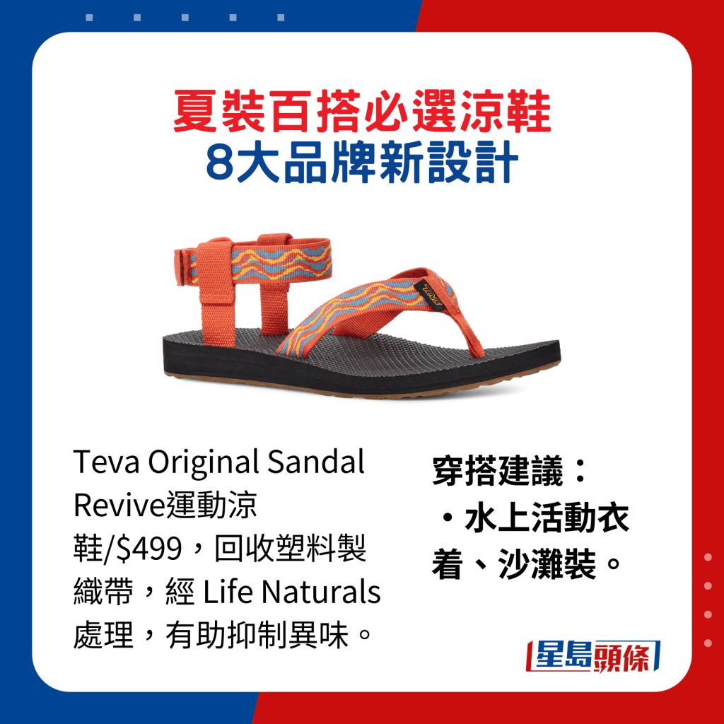 ▲Teva Original Sandal Revive運動涼鞋/$499,回收塑料制織帶,經Life Naturals處理,有助抑制異味。穿搭建議:水上活動衣著、沙灘裝。