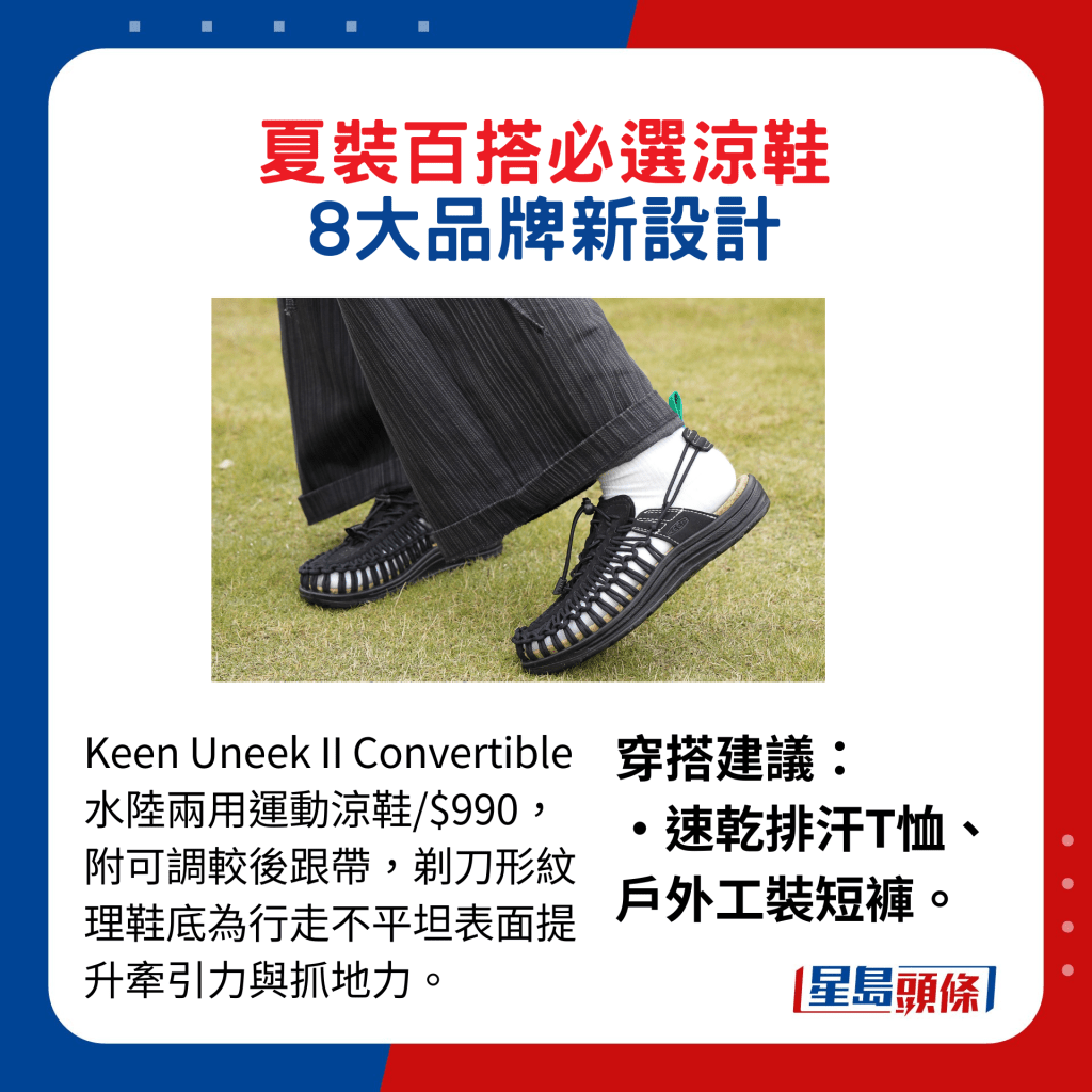 若想更具運動型格,甚至配合戶外衣著,小編推介Teva為慶祝創立40周年而新推的 Original Sandal Revive運動涼鞋。新品沿用上世紀80年代的懷舊彩色鞋帶設計,配以回收塑料制造的速干織帶及回收橡膠外底,鮮艷又跳脫。至于Keen的水陸戶外兩用的Uneek涼鞋亦適值10周年,新推的Uneek II Convertible水陸兩用版本,特別之處在于后跟帶換成可調較設計,穿者可按需要變作拖鞋款式,提升靈活性。
