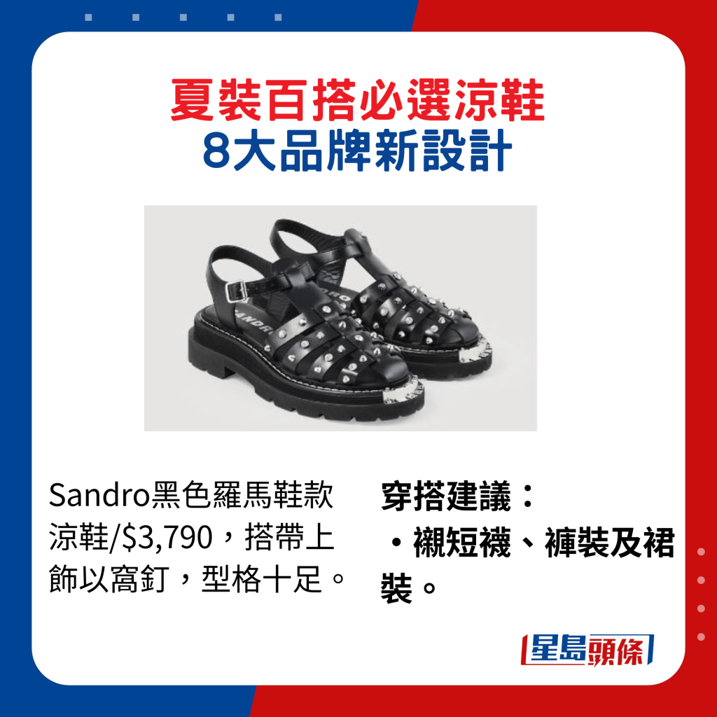 ▲Sandro黑色羅馬鞋款涼鞋/$3,790,搭帶上飾以窩釘,型格十足。穿搭建議:襯短襪、褲裝及裙裝。