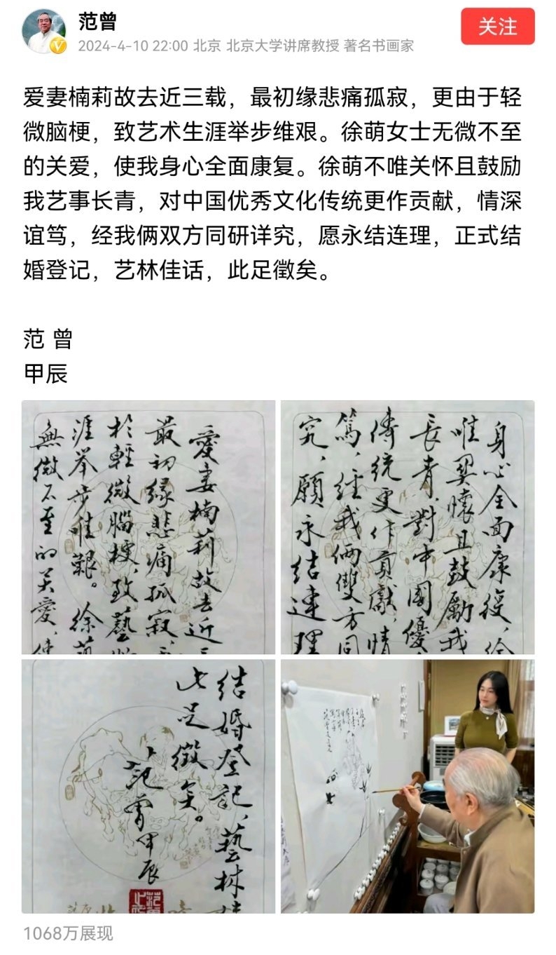昨晚范曾突然宣布再婚,迎娶一名叫徐萌的年輕女子,有指兩人年齡相差50歲。