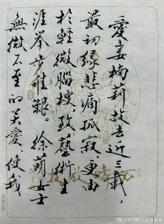 范曾亦分享出愛妻徐萌的照片,見徐萌外型亮麗,有一頭烏黑秀發,靜靜地站在一旁陪伴范曾作畫。