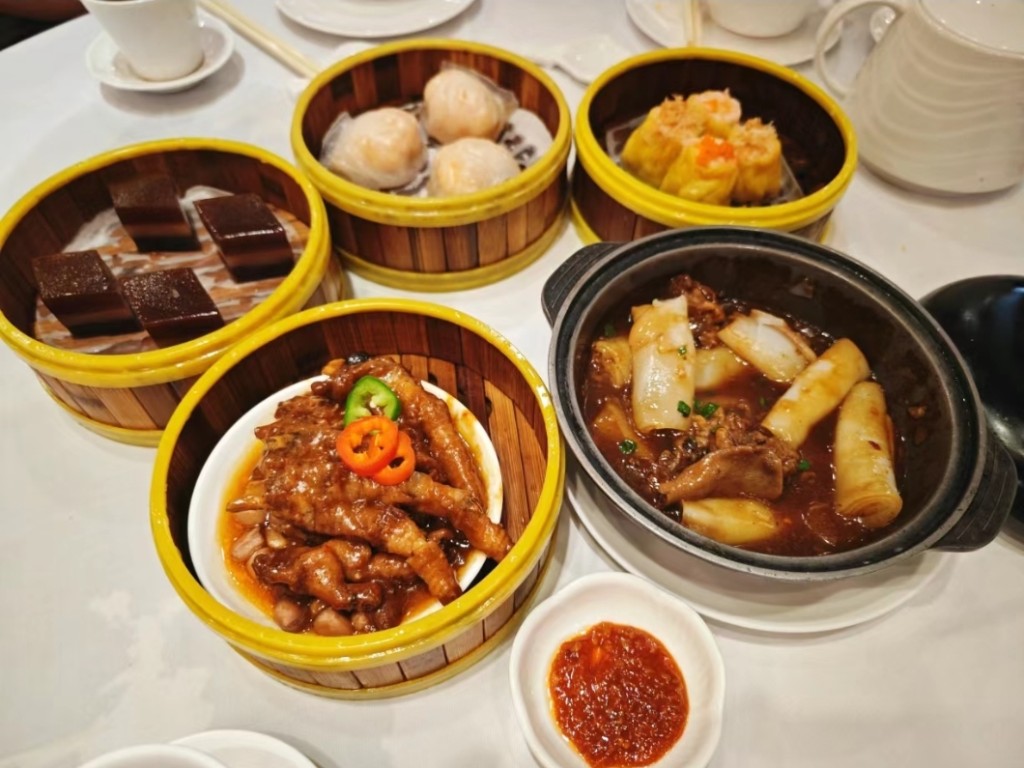 耶倫菜單——餐前小吃:木耳秋葵、爽脆開胃小青瓜。 主菜:陶陶居百年燒鵝、金牌秘制叉燒、冰鎮咕嚕肉、一口酥豆腐、油泡龍躉魚、砂鍋雜菌煲、干炒牛河、山泉水浸菜心。 點心:陶陶居大蝦餃、明爐香滑靚葡撻、錦繡海鮮紅米腸、香煎蘿卜糕、桂妃蛋散、順德大良雙皮奶。 耶倫點的都是非常有代表性的廣式茶點和粵菜,其實陶陶居得到國家貿易局認證“國家特級酒家”,名菜不少,例如豬腦魚云羹、西湖菊花魚、姜蔥炒肉蟹、五彩鮮蝦仁、手撕鹽焗雞等。 美食節得獎菜式有金牌麻皮乳豬、花膠洋參燉水魚、瓦煲鎮江雞、秘制乳鴿皇等。 每天供應近百款點心,最新上架的網紅打卡美食有酸甜媃香清涼卷、脆皮薩琪瑪、鮮肉云朵包、金巴利陳皮豆沙奶酥等。