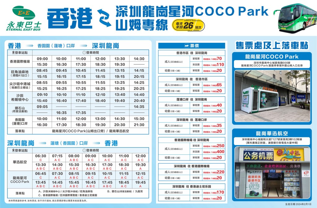 可于香港8個市區站上車,包括鉆石山荷里活廣場、油麻地上海街、尖沙咀中港城、沙田希爾頓中心、荃灣等,經香園圍(蓮塘口岸)過關,約20分鐘直達深圳龍崗星河COCO Park及港人大愛的山姆超市Sam's Club。 每日去程最早為8:45am,回程有多個時間選擇,最早是2:45pm,最遲是7:45pm,來回原價$140,現買一送一$70。