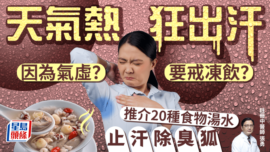 天氣轉熱,汗量大增,部分人更動輒便汗流浹背。若容易出汗、汗量異常多,易致體味濃烈、汗臭,甚至有狐臭煩惱,可如何改善?注冊中醫師張勇表示,中醫藥學有其調理臟腑、防治多汗癥的方法。他講解多汗、有體味的原因、癥狀,并推介20種食物及湯水止汗、除狐臭。